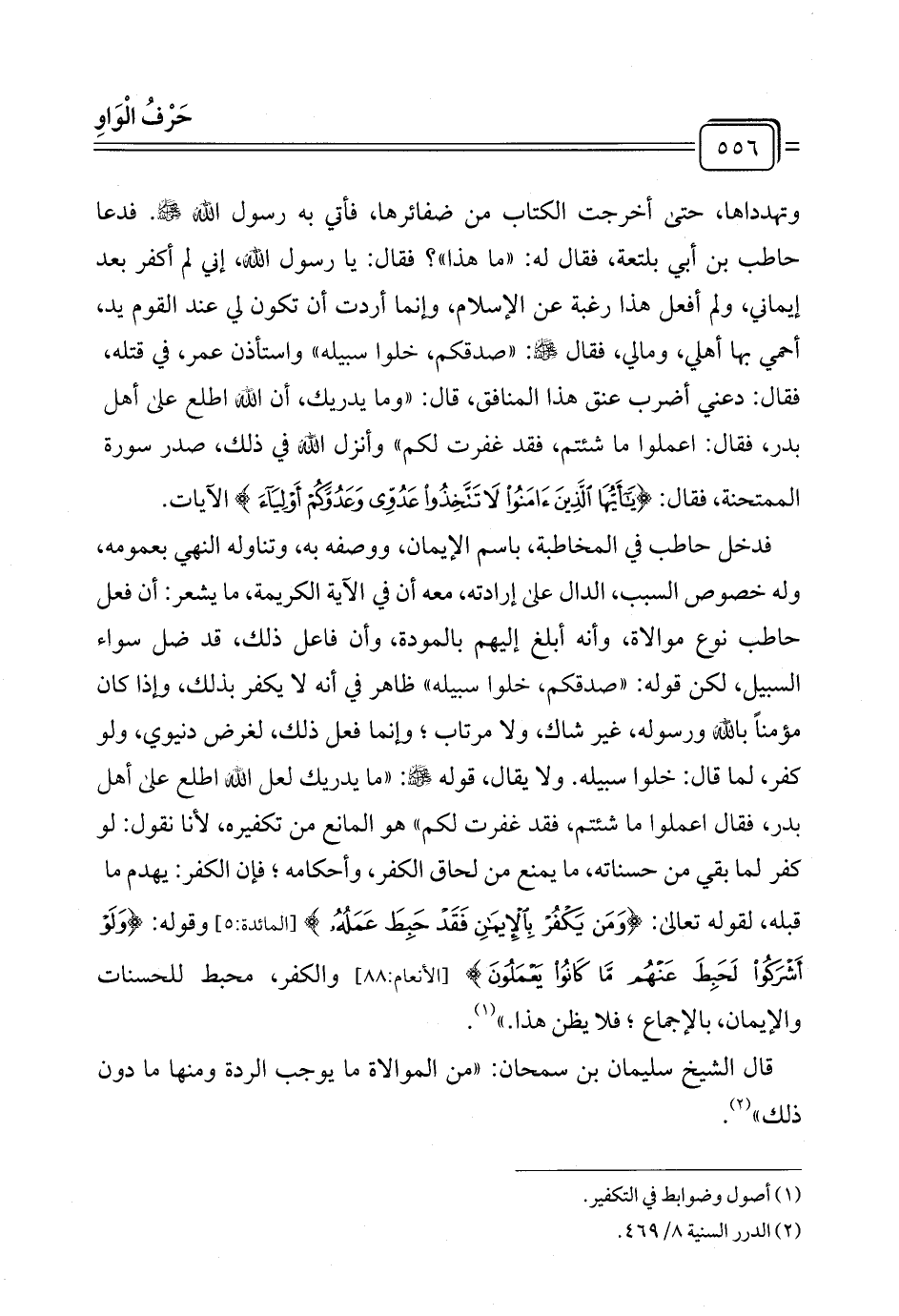 قال الشيخ سليمان بن سمحان: "من الموالاة ما يوجب الردة ومنها ما دون ذلك" (¬٢).