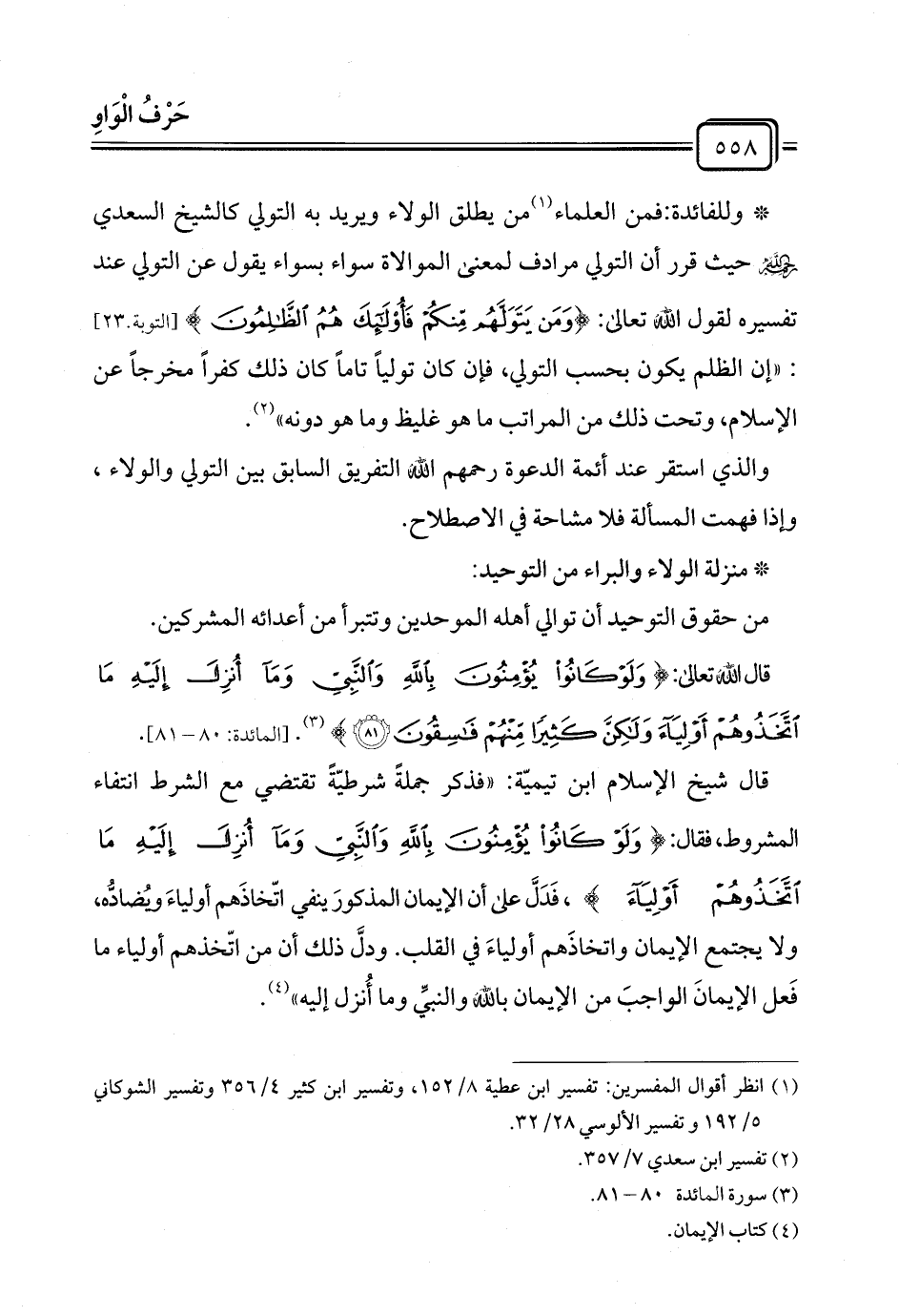 * وللفائدة: فمن العلماء (¬١) من يطلق الولاء ويريد به التولي كالشيخ السعدي - صلى الله عليه وسلم - حيث قرر أن التولي مرادف لمعنى الموالاة سواء بسواء يقول عن التولي عند تفسيره لقول الله تعالى: {وَمَنْ يَتَوَلَّهُمْ مِنْكُمْ فَأُولَئِكَ هُمُ الظَّالِمُونَ} [التوبة: ٢٣]: "إن الظلم يكون بحسب التولي، فإن كان توليًا تامًا كان ذلك كفرًا مخرجًا عن الإسلام، وتحت ذلك من المراتب ما هو غليظ وما هو دونه" (¬٢).