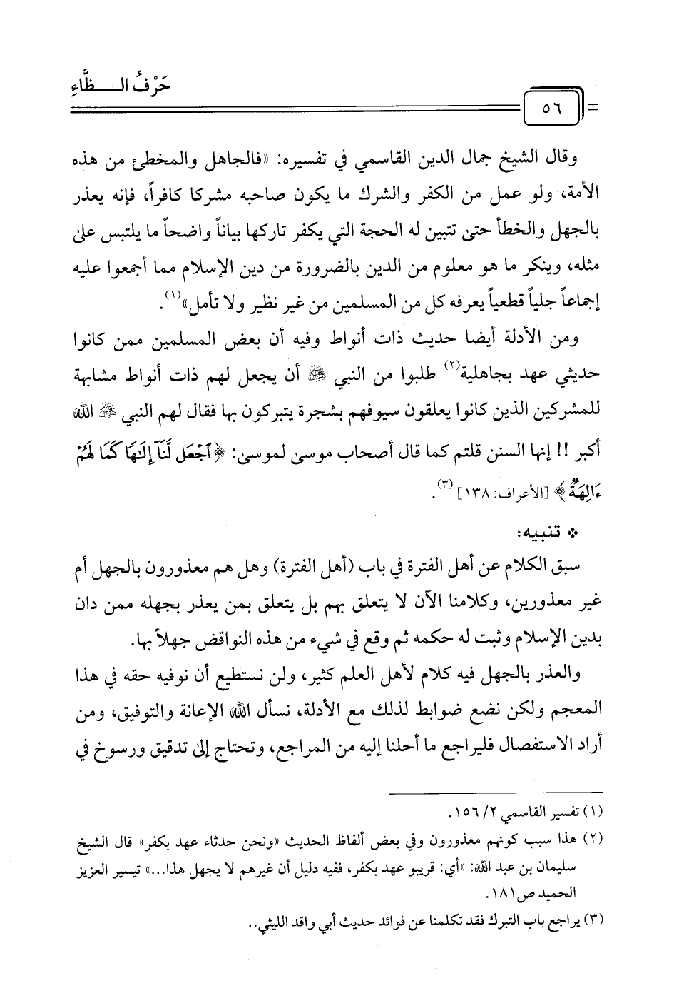 وقال الشيخ جمال الدين القاسمي في تفسيره: "فالجاهل والمخطئ من هذه الأمة، ولو عمل من الكفر والشرك ما يكون صاحبه مشركا كافرًا، فإنه يعذر بالجهل والخطأ حتى تتبين له الحجة التي يكفر تاركها بيانًا واضحًا ما يلتبس على مثله، وينكر ما هو معلوم من الدين بالضرورة من دين الإسلام مما أجمعوا عليه إجماعًا جَليًا قطعيًا يعرفه كل من المسلمين من غير نظير ولا تأمل" (¬١).
