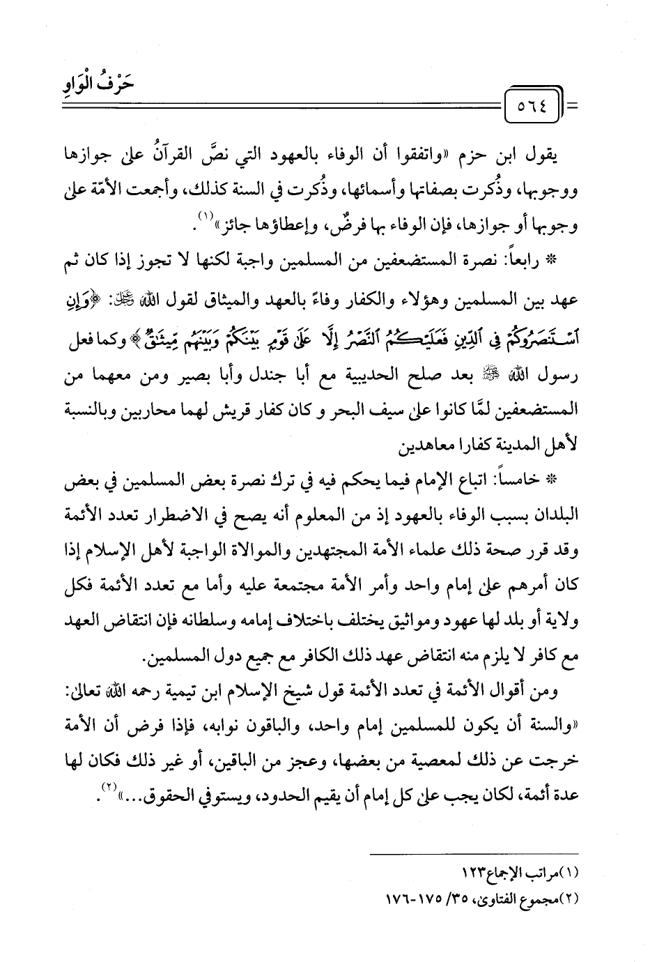 * خامسًا: اتباع الإمام فيما يحكم فيه في ترك نصرة بعض المسلمين في بعض البلدان بسبب الوفاء بالعهود إذ من المعلوم أنه يصح في الاضطرار تعدد الأئمة وقد قرر صحة ذلك علماء الأمة المجتهدين والموالاة الواجبة لأهل الإسلام إذا كان أمرهم على إمام واحد وأمر الأمة مجتمعة عليه وأما مع تعدد الأئمة فكل ولاية أو بلد لها عهود ومواثيق يختلف باختلاف إمامه وسلطانه فإن انتقاض العهد مع كافر لا يلزم منه انتقاض عهد ذلك الكافر مع جميع دول المسلمين.