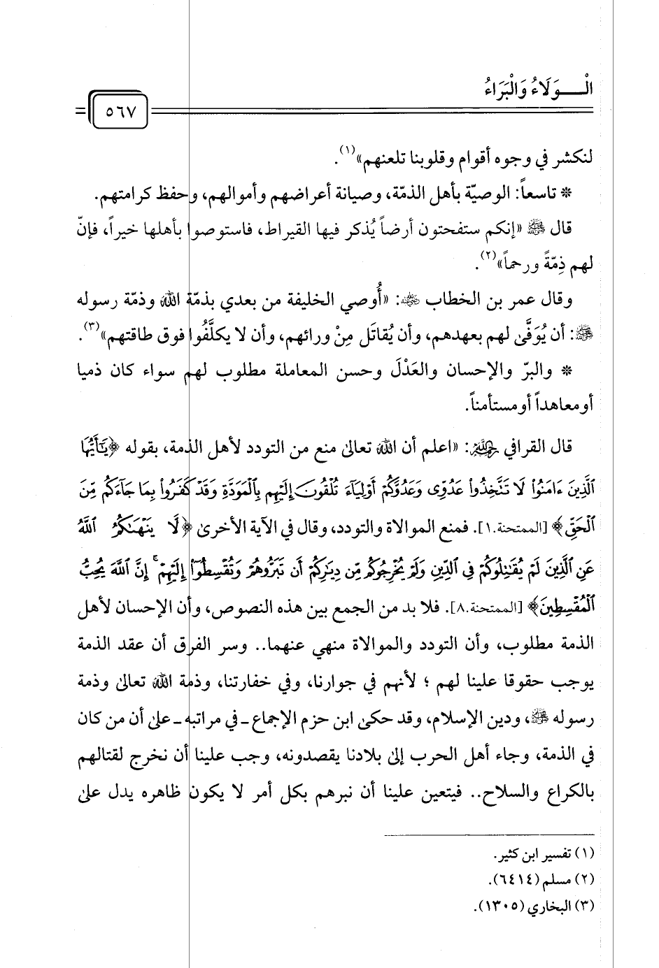 قال القرافي - رَحِمَه اللَّهُ -: "اعلم أن الله تعالى منع من التودد لأهل الذمة، بقوله {يَاأَيُّهَا الَّذِينَ آمَنُوا لَا تَتَّخِذُوا عَدُوِّي وَعَدُوَّكُمْ أَوْلِيَاءَ تُلْقُونَ إِلَيْهِمْ بِالْمَوَدَّةِ وَقَدْ كَفَرُوا بِمَا جَاءَكُمْ مِنَ الْحَقِّ} [الممتحنة: ١]. فمنع الموالاة والتودد، وقال في الآية الأخرى {لَا يَنْهَاكُمُ اللَّهُ عَنِ الَّذِينَ لَمْ يُقَاتِلُوكُمْ فِي الدِّينِ وَلَمْ يُخْرِجُوكُمْ مِنْ دِيَارِكُمْ أَنْ تَبَرُّوهُمْ وَتُقْسِطُوا إِلَيْهِمْ إِنَّ اللَّهَ يُحِبُّ الْمُقْسِطِينَ} [الممتحنة: ٨]. فلا بد من الجمع بين هذه النصوص، وأن الإحسان لأهل الذمة مطلوب، وأن التودد والموالاة منهي عنهما .. وسر الفرق أن عقد الذمة يوجب حقوقا علينا لهم؛ لأنهم في جوارنا، وفي خفارتنا، وذمة الله تعالى وذمة رسوله - صلى الله عليه وسلم -، ودين الإسلام، وقد حكى ابن حزم الإجماع - في مراتبه - على أن من كان في الذمة، وجاء أهل الحرب إلى بلادنا يقصدونه، وجب علينا أن نخرج لقتالهم بالكراع والسلاح .. فيتعين علينا أن نبرهم بكل أمر لا يكون ظاهره يدل على