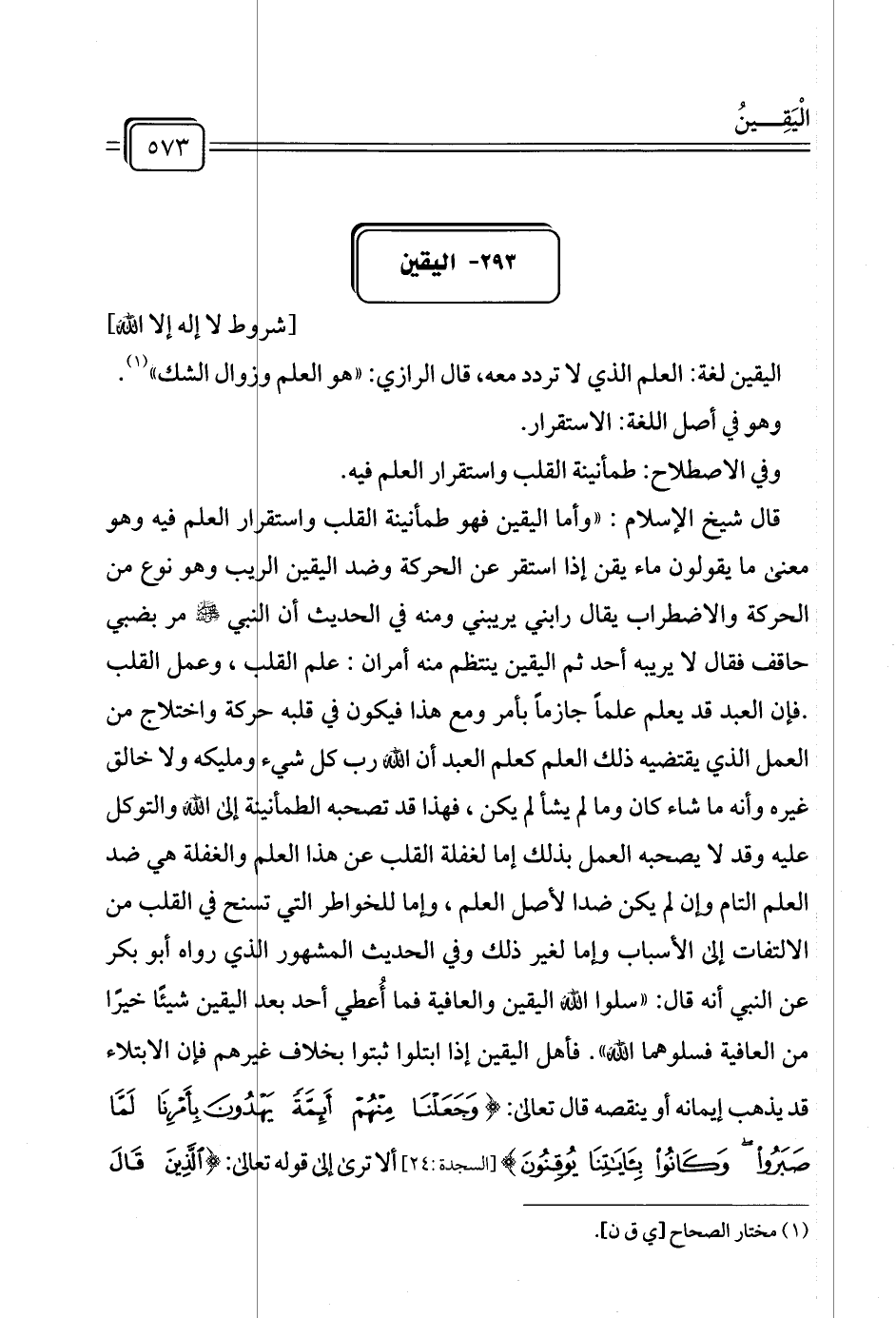 قال شيخ الإسلام: "وأما اليقين فهو طمأنينة القلب واستقرار العلم فيه وهو معنى ما يقولون ماء يقن إذا استقر عن الحركة وضد اليقين الريب وهو نوع من الحركة والاضطراب يقال رابني يريبني ومنه في الحديث أن النبي - صلى الله عليه وسلم - مر بضبي حاقف فقال لا يريبه أحد ثم اليقين ينتظم منه أمران: علم القلب، وعمل القلب فإن العبد قد يعلم علمًا جازمًا بأمر ومع هذا فيكون في قلبه حركة واختلاج من العمل الذي يقتضيه ذلك العلم كعلم العبد أن الله رب كل شيء ومليكه ولا خالق غيره وأنه ما شاء كان وما لم يشأ لم يكن، فهذا قد تصحبه الطمأنينة إلى الله والتوكل عليه وقد لا يصحبه العمل بذلك إما لغفلة القلب عن هذا العلم والغفلة هي ضد العلم التام وإن لم يكن ضدا لأصل العلم، وإما للخواطر التي تسنح في القلب من الالتفات إلى الأسباب وإما لغير ذلك وفي الحديث المشهور الذي رواه أبو بكر عن النبي أنه قال: "سلوا الله اليقين والعافية فما أُعطي أحد بعد اليقين شيئًا خيرًا من العافية فسلوهما الله". فأهل اليقين إذا ابتلوا ثبتوا بخلاف غيرهم فإن الابتلاء قد يذهب إيمانه أو ينقصه قال تعالى: {وَجَعَلْنَا مِنْهُمْ أَئِمَّةً يَهْدُونَ بِأَمْرِنَا لَمَّا صَبَرُوا وَكَانُوا بِآيَاتِنَا يُوقِنُونَ} [السجدة: ٢٤] ألا ترى إلى قوله تعالى: {الَّذِينَ قَالَ