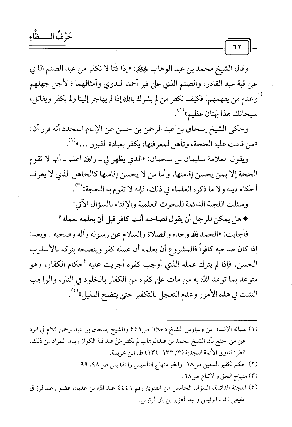 (¬١) صيانة الإنسان من وساوس الشيخ دحلان ص ٤٩٩ وللشيخ إسحاق بن عبد الرحمن كلام في الرد على من احتج بأن الشيخ محمد بن عبد الوهاب لم يكفِّر مَنْ عبد قبة الكواز وبيان المراد من ذلك.