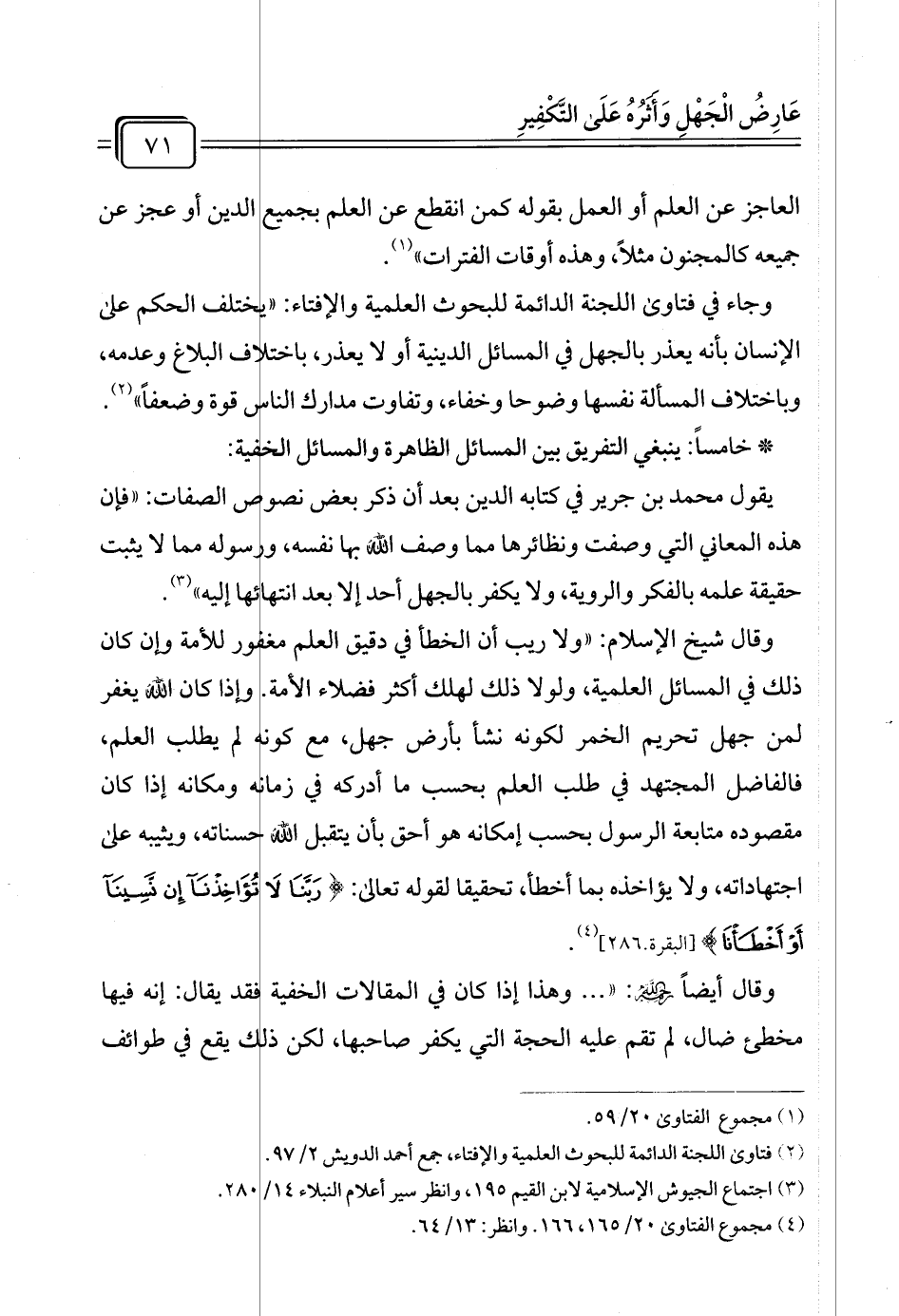 وجاء في فتاوى اللجنة الدائمة للبحوث العلمية والإفتاء: "يختلف الحكم على الإنسان بأنه يعذر بالجهل في المسائل الدينية أو لا يعذر، باختلاف البلاغ وعدمه، وباختلاف المسألة نفسها وضوحا وخفاء، وتفاوت مدارك الناس قوة وضعفًا" (¬٢).