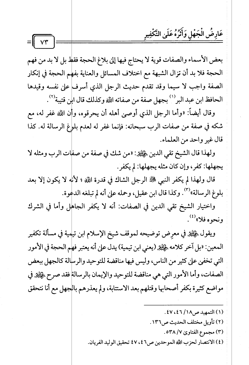 بعض الأسماء والصفات قوية لا يحتاج فيها إلى بلاغ الحجة فقط بل لا بد من فهم الحجة فلا بد أن تزال الشبهة مع اختلاف المسائل والعناية بفهم الحجة في إنكار الصفة واجب لا سيما وقد تقدم حديث الرجل الذي أسرف على نفسه وقيدها الحافظ ابن عبد البر (¬١) بجهل صفة من صفاته الله وكذلك قال ابن قتيبة (¬٢).
