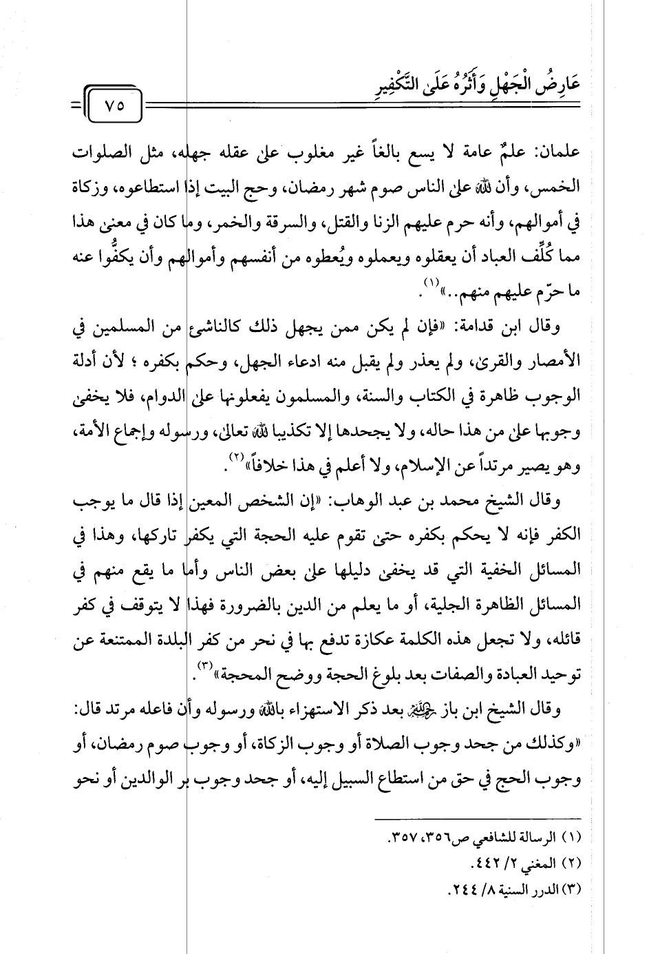 وقال الشيخ محمد بن عبد الوهاب: "إن الشخص المعين إذا قال ما يوجب الكفر فإنه لا يحكم بكفره حتى تقوم عليه الحجة التي يكفر تاركها، وهذا في المسائل الخفية التي قد يخفى دليلها على بعض الناس وأما ما يقع منهم في المسائل الظاهرة الجلية، أو ما يعلم من الدين بالضرورة فهذا لا يتوقف في كفر قائله، ولا تجعل هذه الكلمة عكازة تدفع بها في نحر من كفر البلدة: الممتنعة عن توحيد العبادة والصفات بعد بلوغ الحجة ووضح المحجة" (¬٣).