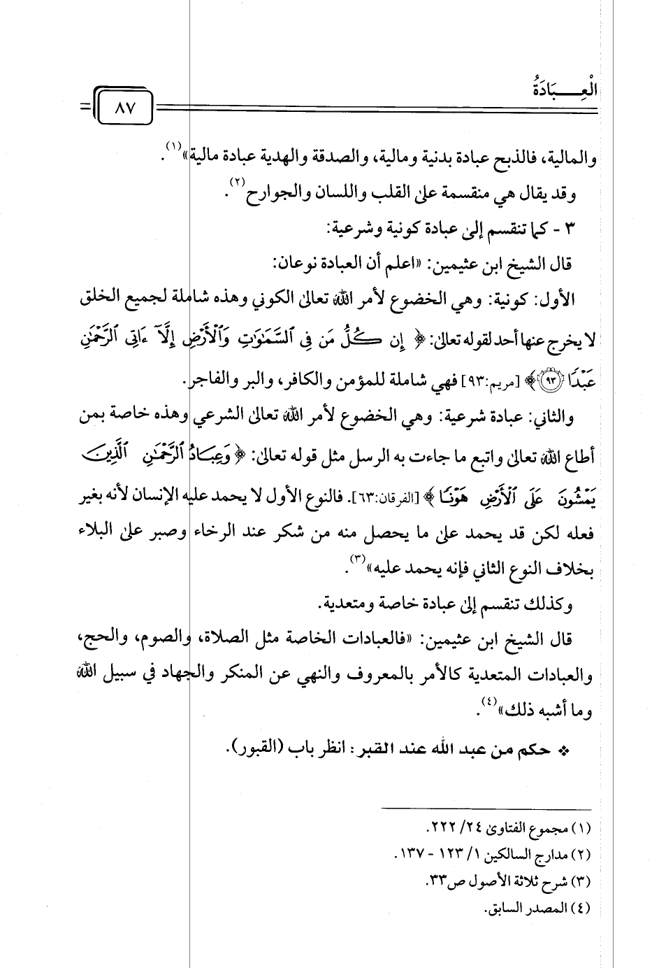 والثاني: عبادة شرعية: وهي الخضوع لأمر الله تعالى الشرعي وهذه خاصة بمن أطاع الله تعالى واتبع ما جاءت به الرسل مثل قوله تعالى: {وَعِبَادُ الرَّحْمَنِ الَّذِينَ يَمْشُونَ عَلَى الْأَرْضِ هَوْنًا} [الفرقان:٦٣]. فالنوع الأول لا يحمد الإنسان لأنه بغير فعله لكن قد يحمد على ما يحصل منه من شكر عند الرخاء وصبر على البلاء بخلاف النوع الثاني فإنه يحمد عليه" (¬٣).