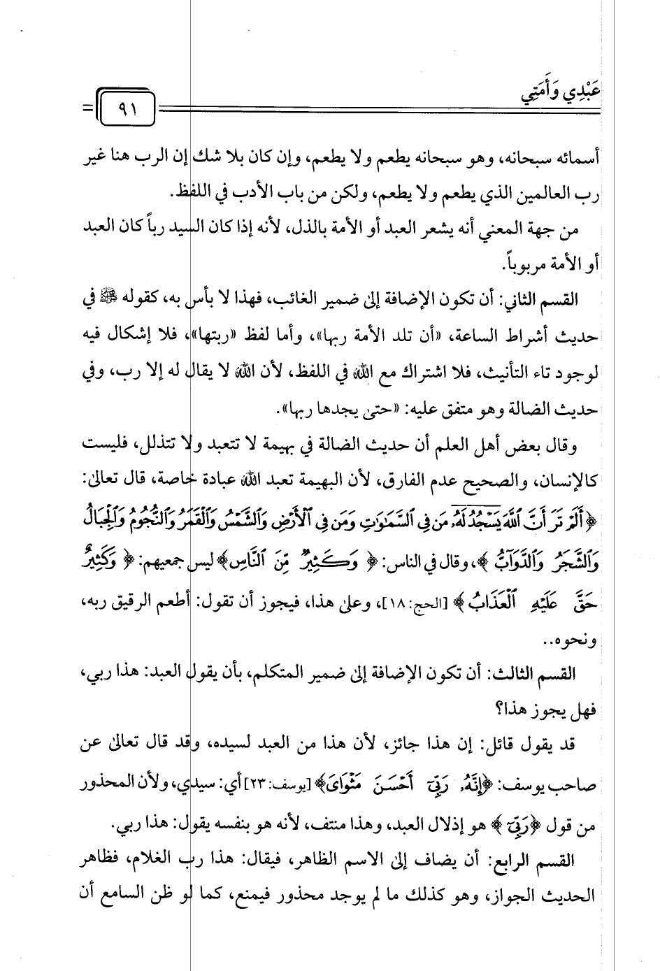 القسم الثاني: أن تكون الإضافة إلى ضمير الغائب، فهذا لا بأس به، كقوله به، كقوله - صلى الله عليه وسلم - في حديث أشراط الساعة، "أن تلد الأمة ربها"، وأما لفظ "ربتها"، فلا إشكال فيه لوجود تاء التأنيث، فلا اشتراك مع الله في اللفظ، لأن الله لا يقاله إلا رب، وفي حديث الضالة وهو متفق عليه: "حتى يجدها ربها".