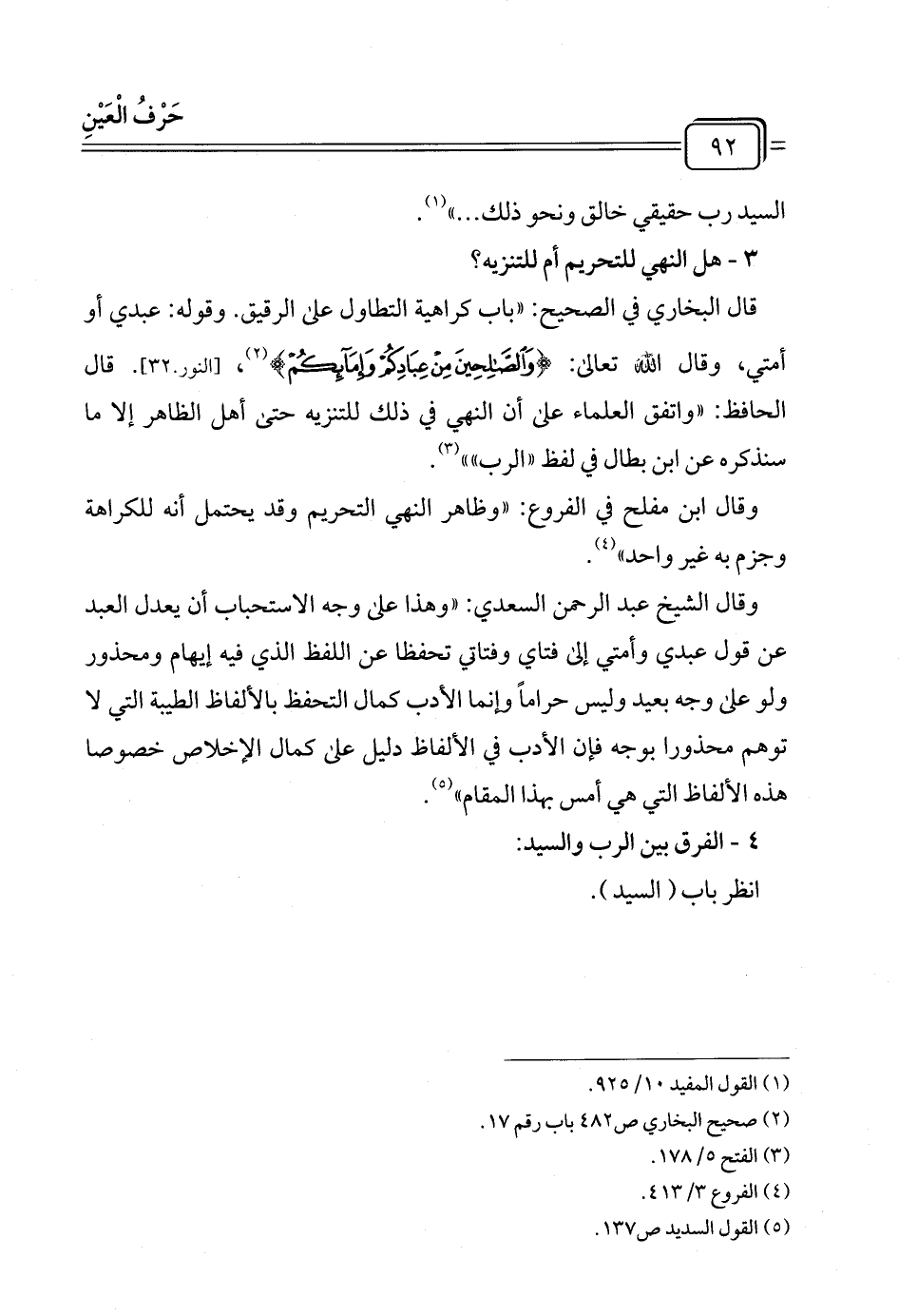 وقال الشيخ عبد الرحمن السعدي: "وهذا على وجه الاستحباب أن يعدل العبد عن قول عبدي وأمتي إلى فتاي وفتاتي تحفظا عن اللفظ الذي فيه إيهام ومحذور ولو على وجه بعيد وليس حرامًا وإنما الأدب كمال التحفظ بالألفاظ الطيبة التي لا توهم محذورا بوجه فإن الأدب في الألفاظ دليل على كمال الإخلاص خصوصا هذه الألفاظ التي هي أمس بهذا المقام" (¬٥).