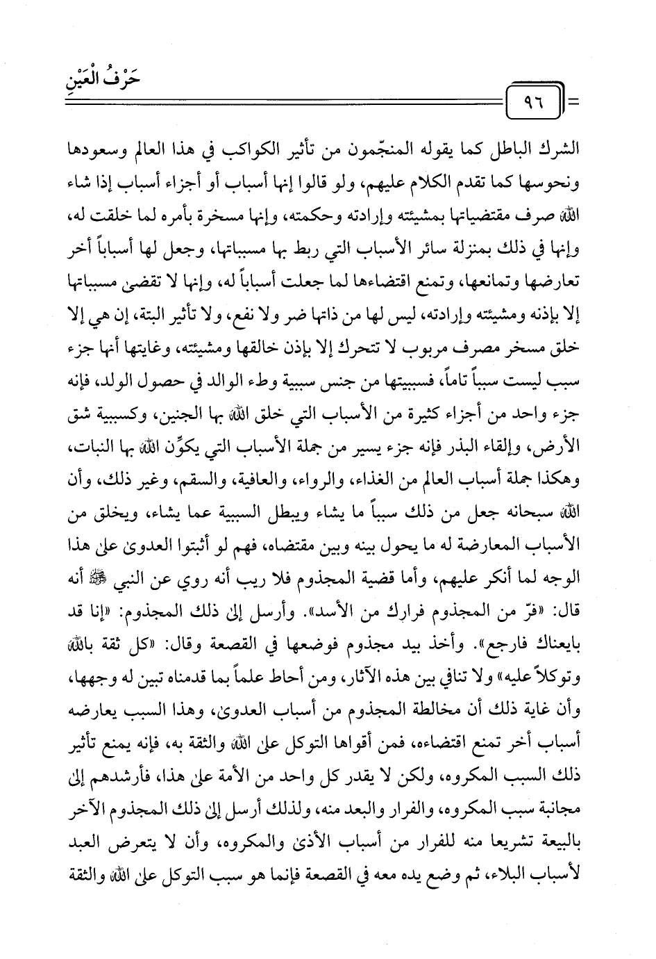 الشرك الباطل كما يقوله المنجّمون من تأثير الكواكب في هذا العالم وسعودها ونحوسها كما تقدم الكلام عليهم، ولو قالوا إنها أسباب أو أجزاء أسباب إذا شاء الله صرف مقتضياتها بمشيئته وإرادته وحكمته، وإنها مسخرة بأمره لما خلقت له، وإنها في ذلك بمنزلة سائر الأسباب التي ربط بها مسبباتها، وجعل لها أسبابًا أخر تعارضها وتمانعها، وتمنع اقتضاءها لما جعلت أسبابًا له، وإنها لا تقضى مسبباتها إلا بإذنه ومشيئته وإرادته، ليس لها من ذاتها ضر ولا نفع، ولا تأثير البتة، إن هي إلا خلق مسخر مصرف مربوب لا تتحرك إلا بإذن خالقها ومشيئته، وغايتها أنها جزء سبب ليست سببًا تامًا، فسببيتها من جنس سببية وطء الوالد في حصول الولد، فإنه جزء واحد من أجزاء كثيرة من الأسباب التي خلق الله بها الجنين، وكسببية شق الأرض، وإلقاء البذر فإنه جزء يسير من جملة الأسباب التي يكوِّن الله بها النبات، وهكذا جملة أسباب العالم من الغذاء، والرواء، والعافية، والسقم، وغير ذلك، وأن الله سبحانه جعل من ذلك سببًا ما يشاء ويبطل السببية عما يشاء، ويخلق من الأسباب المعارضة له ما يحول بينه وبين مقتضاه، فهم لو أثبتوا العدوى على هذا الوجه لما أنكر عليهم، وأما قضية المجذوم فلا ريب أنه روي عن النبي - صلى الله عليه وسلم - أنه قال: "فرّ من المجذوم فرارك من الأسد". وأرسل إلى ذلك المجذوم: "إنا قد بايعناك فارجع". وأخذ بيد مجذوم فوضعها في القصعة وقال: "كل ثقة بالله وتوكلًا عليه" ولا تنافي بين هذه الآثار، ومن أحاط علمًا بما قدمناه تبين له وجهها، وأن غاية ذلك أن مخالطة المجذوم من أسباب العدوى، وهذا السبب يعارضه أسباب أخر تمنع اقتضاءه، فمن أقواها التوكل على الله والثقة به، فإنه يمنع تأثير ذلك السبب المكروه، ولكن لا يقدر كل واحد من الأمة على هذا، فأرشدهم إلى مجانبة سبب المكروه، والفرار والبعد منه، ولذلك أرسل إلى ذلك المجذوم الآخر بالبيعة تشريعا منه للفرار من أسباب الأذى والمكروه، وأن لا يتعرض العبد لأسباب البلاء، ثم وضع يده معه في القصعة فإنما هو سبب التوكل على الله والثقة