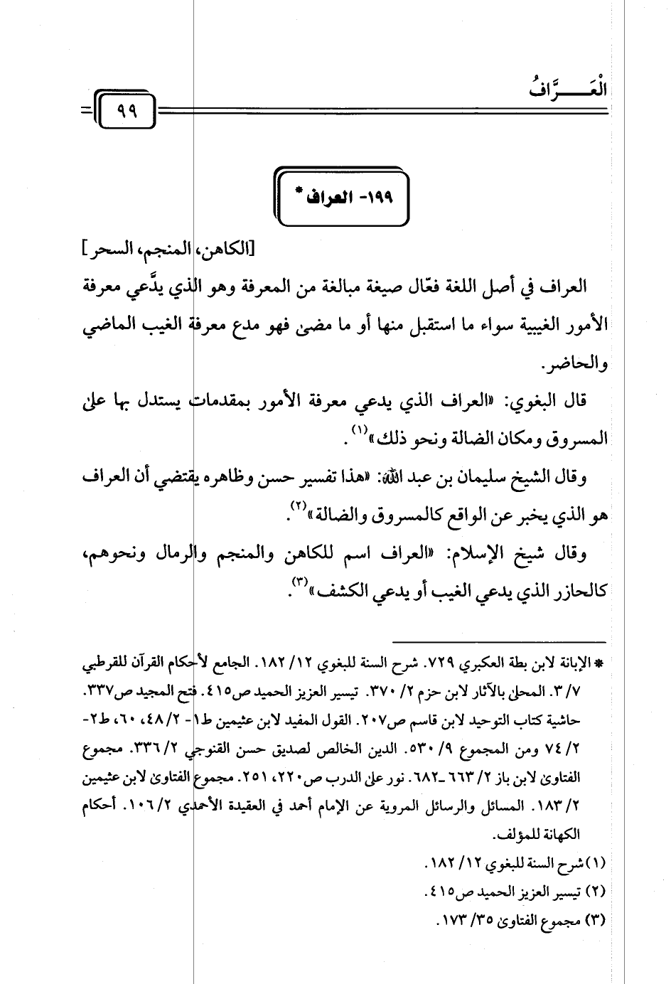 * الإبانة لابن بطة العكبري ٧٢٩. شرح السنة للبغوي ١٢/ ١٨٢. الجامع لأحكام القرآن للقرطبي ٧/ ٣. المحلى بالآثار لابن حزم ٢/ ٣٧٠. تيسير العزيز الحميد ص ٤١٥. فتح المجيد ص ٣٣٧. حاشية كتاب التوحيد لابن قاسم ص ٢٥٧. القول المفيد لابن عثيمين ط ١ - ٢/ ٤٨، ٦٠، ط ٢ - ٢/ ٧٤ ومن المجموع ٩/ ٥٣٥.الدين الخالص لصديق حسن القنوجي ٢/ ٣٣٦. مجموع الفتاوى لابن باز ٢/ ٦٦٣ - ٦٨٢. نور على الدرب ص ٢٢٠، ٢٥١. مجموع الفتاوى لابن عثيمين ٢/ ١٨٣ المسائل والرسائل المروية عن الإمام أحمد في العقيدة الأحمدي ٢/ ١٠٦.أحكام الكهانة للمؤلف.