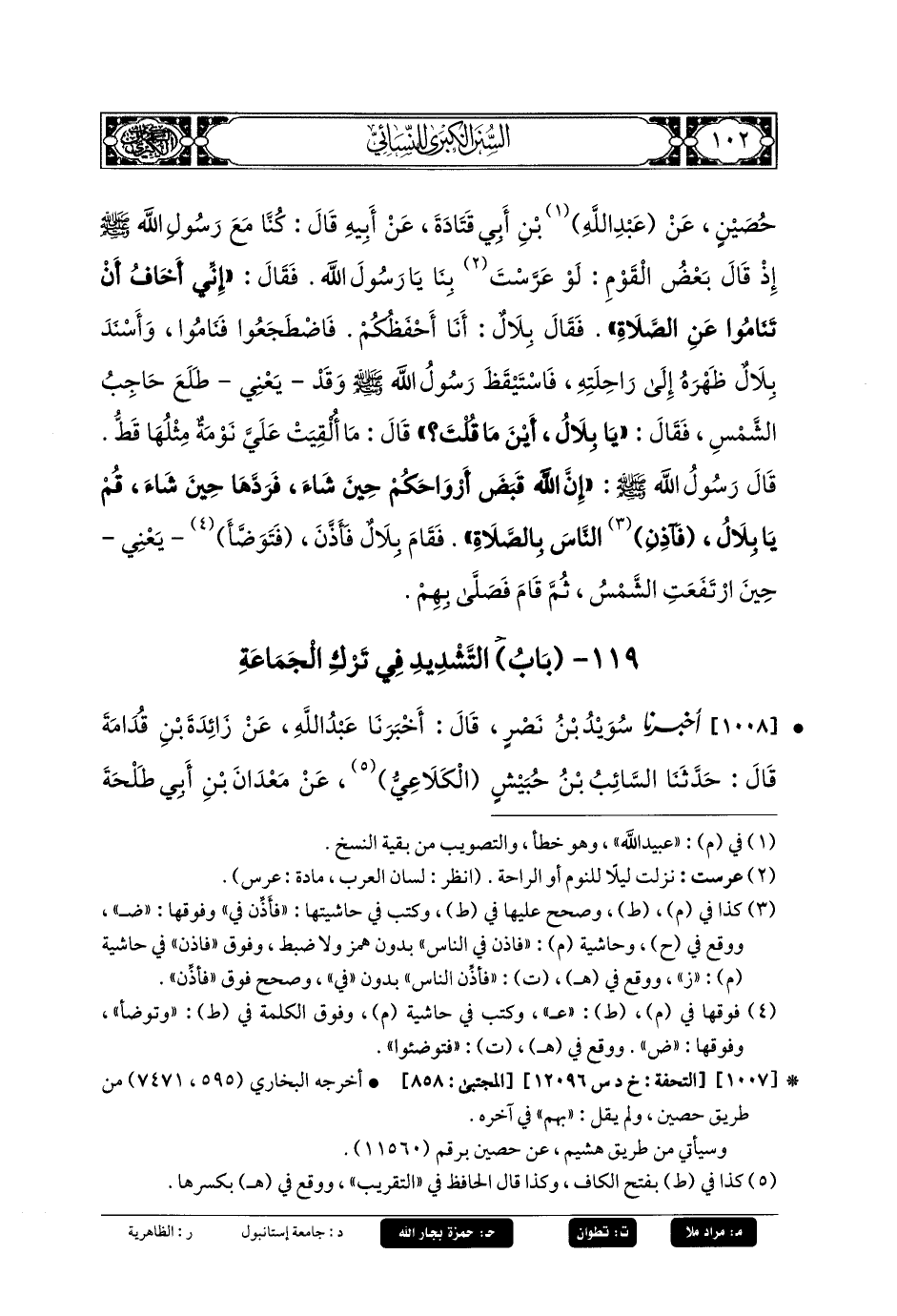 1008- أَخبَرنا سُوَيْدُ بنُ نَصْرٍ، قَالَ: أَخبَرنا عَبدُ اللهِ، عَن زَائِدَةَ بنِ قُدَامَةَ، قَالَ: حَدثنا السَّائِبُ بنُ حُبَيْشٍ الكَلاعِيُّ، عَن مَعْدَانَ بنِ أَبي طَلحَةَ اليَعْمَرِيِّ قَالَ: قَالَ لِي أَبو الدَّرْدَاءِ، أَيْنَ مَسْكَنُكَ؟ فَقُلْتُ: فِي قَرْيَةٍ دُوَيْنَ حِمْصَ، فَقَالَ أَبو الدَّرْدَاءِ، سَمِعْتُ رَسُولَ اللهِ صَلى الله عَليه وسَلم يَقُولُ: مَا مِنْ ثَلاثَةٍ فِي قَرْيَةٍ وَلا بَدْوٍ لا تُقَامُ فِيهِمُ الصَّلاةُ إِلاَّ قَدِ اسْتَحْوَذَ عَلَيْهِمُ الشَّيْطَانُ، فَعَلَيْكَ بِالجَمَاعَةِ فَإِنَّمَا يَأْكُلُ الذِّئْبُ القَاصِيَةَ، قَالَ السَّائِبُ، يَعْنِي بِالجَمَاعَةِ الجَمَاعَةَ فِي الصَّلاةِ.