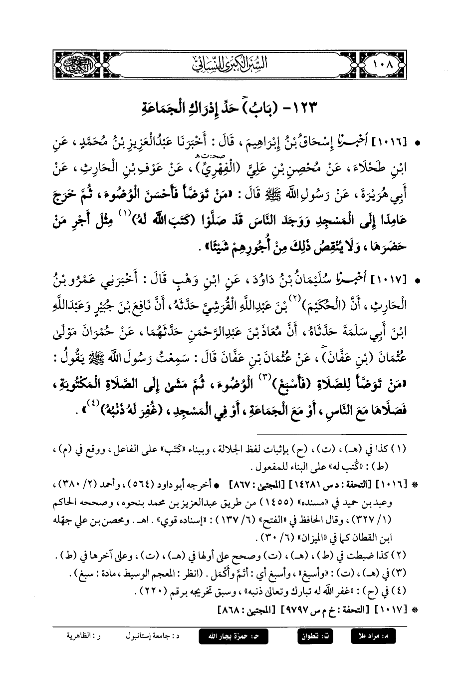 1017- أَخبَرنا سُلَيمَانُ بنُ دَاوُدَ، عَنِ ابنِ وَهْبٍ، قَالَ: أَخبَرني عَمرُو بنُ الحَارِثِ، أَنَّ الحُكَيْمَ بْنَ عَبدِ اللهِ القُرَشِيَّ حَدَّثَهُ، أَنَّ نَافِعَ بْنَ جُبَيرٍ، وَعَبدَ اللهِ بْنَ أَبي سَلَمَةَ حَدَّثَاهُ، أَنَّ مُعَاذَ بْنَ عَبدِ الرَّحمَنِ حَدَّثَهُمَا، عَن حُمْرَانَ، مَوْلَى عُثْمَانَ بن عفان، عَن عُثْمَانَ بنِ عَفَّانَ، قَالَ: سَمِعْتُ رَسُولَ اللهِ صَلى الله عَليه وسَلم يَقُولُ: مَنْ تَوَضَّأَ لِلصَّلاةِ فَأَسْبَغَ الوُضُوءَ، ثُمَّ مَشَى إِلَى الصَّلاةِ المَكْتُوبَةِ فَصَلاَّهَا مَعَ النَّاسِ أَوْ مَعَ الجَمَاعَةِ، أَوْ فِي المَسْجِدِ غُفِرَ لَهُ ذَنْبُهُ.