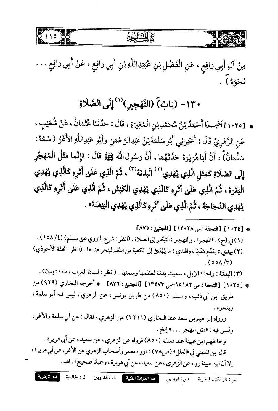 1025- أَخبَرنا أَحْمَدُ بنُ مُحَمدِ بنِ المُغِيرَةِ، قَالَ: حَدثنا عُثْمَانُ، عَن شُعَيبٍ، عَنِ الزُّهْرِيِّ، قَالَ: أَخبَرني أَبو سَلَمَةَ بنُ عَبدِ الرَّحمَنِ، وَأَبو عَبدِ اللهِ الأَغَرُّ اسمه سلمان، أَنَّ أَبَا هُرَيرَةَ حَدَّثَهُمَا، أَنَّ رَسُولَ اللهِ صَلى الله عَليه وسَلم، قَالَ: إِنَّمَا مَثَلُ المُهَجِّرِ إِلَى الصَّلاةِ كَمَثَلِ الَّذِي يَهْدِي البَدَنَةَ، ثُمَّ الَّذِي عَلَى أثَرِهِ كَالَّذِي يَهْدِي البَقَرَةَ، ثُمَّ الَّذِي عَلَى إثَرِهِ كَالَّذِي يَهْدِي الكَبْشَ، ثُمَّ الَّذِي عَلَى أثرِهِ كَالَّذِي يَهْدِي الدَّجَاجَةَ، ثُمَّ الَّذِي عَلَى إثَرِهِ كَالَّذِي يَهْدِي البَيْضَةَ.