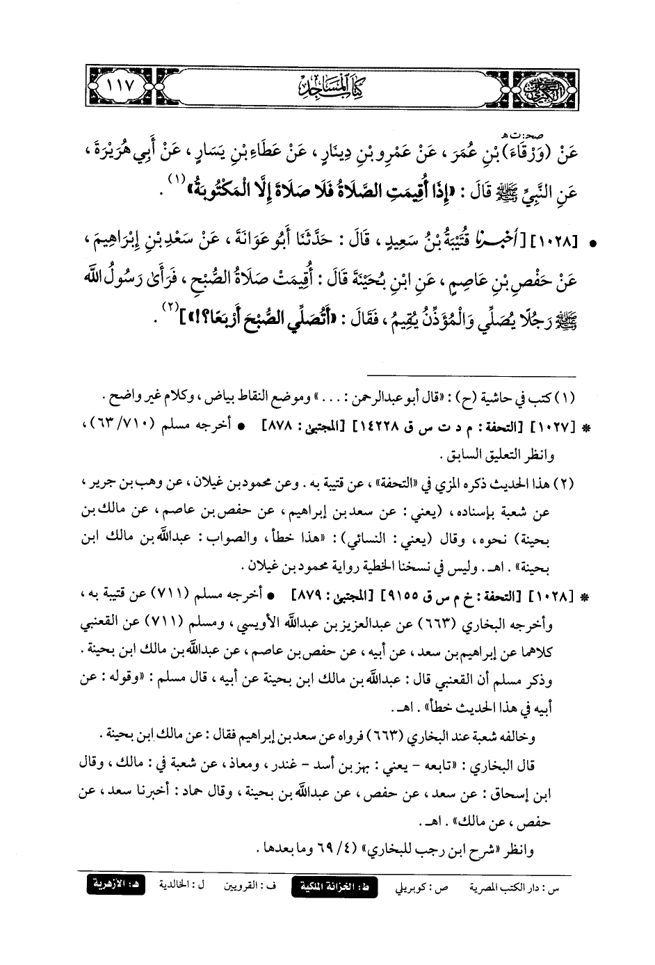 1028- أَخبَرنا قُتَيبَةُ بنُ سَعِيدٍ، قَالَ: حَدثنا أَبو عَوَانَةَ، عَن سَعْدِ بنِ إِبرَاهِيمَ، عَن حَفْصِ بنِ عَاصِمٍ، عَنِ ابنِ بُحَيْنَةَ قَالَ: أُقِيمَتْ صَلاةُ الصُّبْحِ، فَرَأَى رَسُولُ اللهِ صَلى الله عَليه وسَلم رَجُلاً يُصَلِّي وَالمُؤَذِّنُ يُقِيمُ، فَقَالَ: أَتُصَلِّي الصُّبْحَ أَرْبَعًا؟.