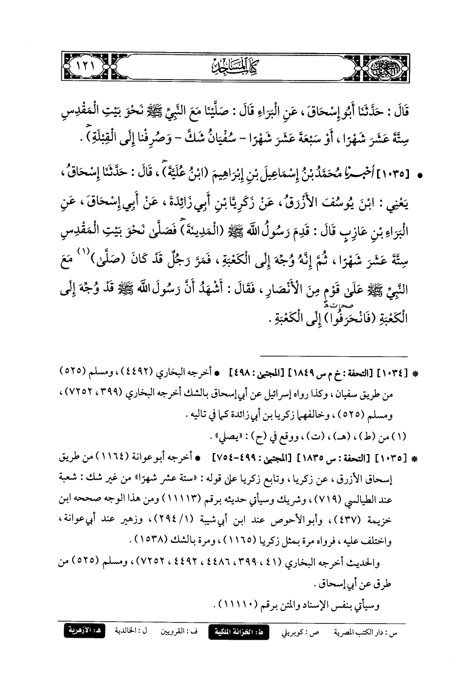 1035- أَخبَرنا مُحَمدُ بنُ إِسمَاعِيلَ بنِ إِبرَاهِيمَ ابن علية، قَالَ: حَدثنا إِسحَاقُ، يَعْنِي ابنَ يُوسُفَ الأَزْرَقَ، عَن زَكَرِيَّا بنِ أَبي زَائِدَةَ، عَن أَبي إِسحَاقَ، عَنِ البَرَاءِ بنِ عَازِبٍ قَالَ: قَدِمَ رَسُولُ اللهِ صَلى الله عَليه وسَلم، المدينة فَصَلَّى نَحْوَ بَيْتِ المَقْدِسِ سِتَّةَ عَشَرَ شَهْرًا، ثُمَّ إِنَّهُ وُجِّهَ إِلَى الكَعْبَةِ، فَمَرَّ رَجُلٌ قَدْ كَانَ صَلَّى مَعَ النَّبيِّ صَلى الله عَليه وسَلم عَلَى قَوْمٍ مِنَ الأَنْصَارِ، فَقَالَ: أَشْهَدُ أَنَّ رَسُولَ اللهِ صَلى الله عَليه وسَلم قَدْ وُجِّهَ إِلَى الكَعْبَةِ، فَانْحَرَفُوا إِلَى الكَعْبَةِ.
