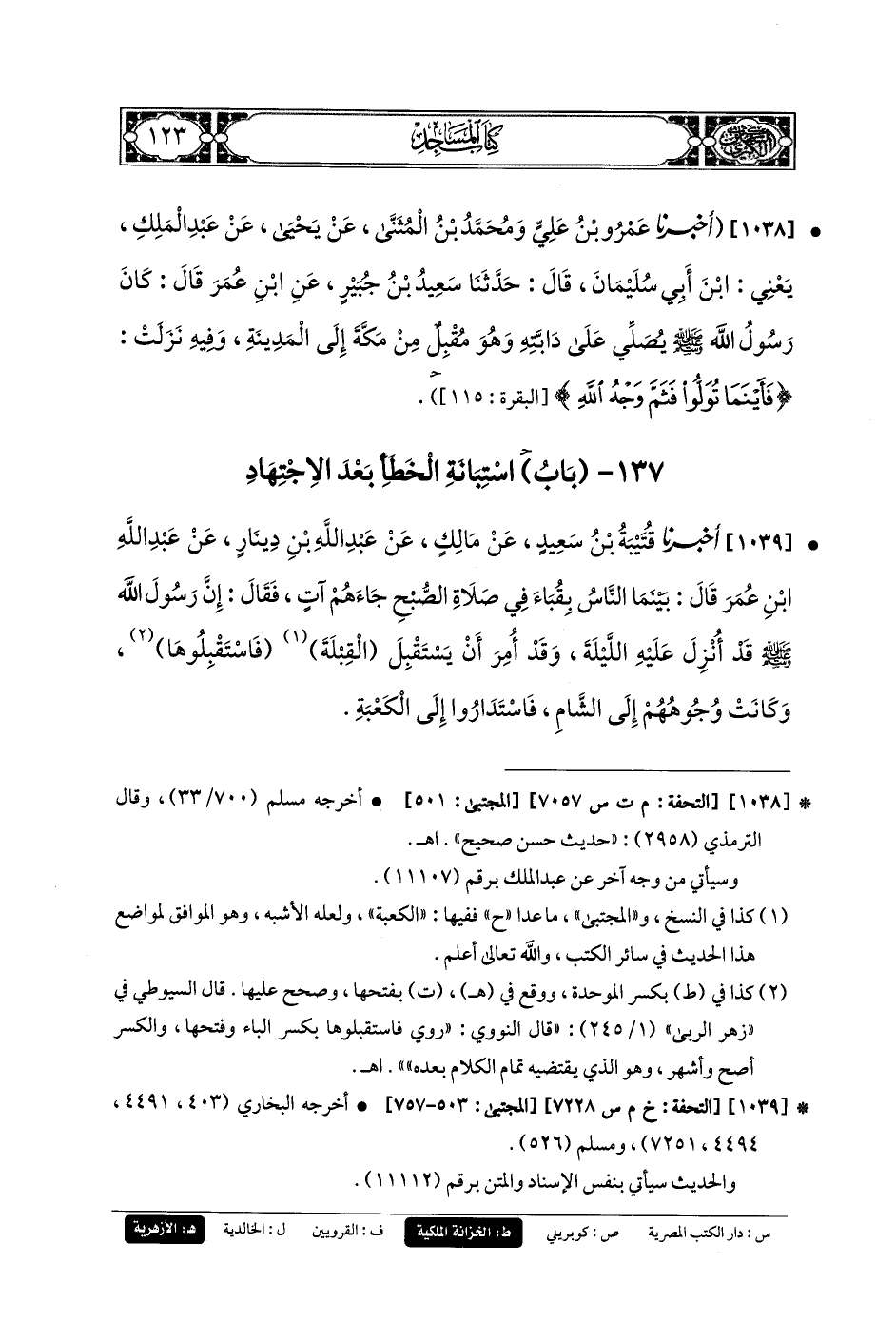 1039- أَخبَرنا قُتَيبَةُ بنُ سَعِيدٍ، عَن مَالِكٍ، عَن عَبدِ اللهِ بنِ دِينَارٍ، عَن عَبدِ اللهِ بنِ عُمَرَ قَالَ: بَيْنَمَا النَّاسُ بِقُبَاءٍ فِي صَلاةِ الصُّبْحِ جَاءَهُمْ آتٍ، فَقَالَ: إِنَّ رَسُولَ اللهِ صَلى الله عَليه وسَلم قَدْ أُنْزِلَ عَلَيْهِ اللَّيْلَةَ، وَقَدْ أُمِرَ أَنْ يَسْتَقْبِلَ القِبْلَةَ فَاسْتَقْبِلُوهَا، وَكَانَتْ وُجُوهُهُمْ إِلَى الشَّامِ فَاسْتَدَارُوا إِلَى الكَعْبَةِ.