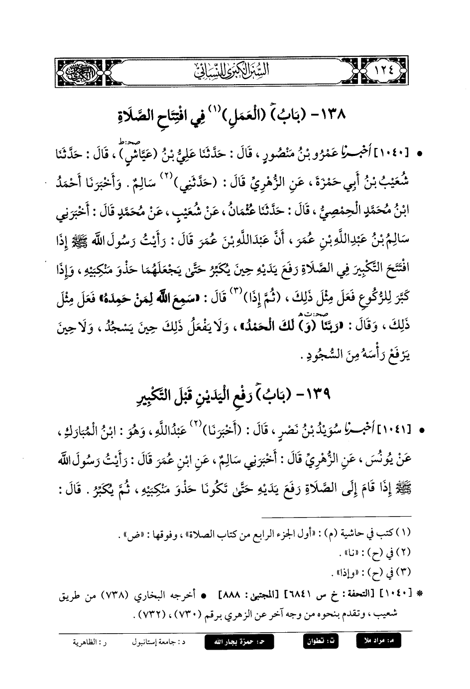 1040- أَخبَرنا عَمرُو بنُ مَنصُورٍ، قَالَ: حَدثنا عَليُّ بنُ عَيَّاشٍ، قَالَ: حَدثنا شُعَيبُ بنُ أَبي حَمْزَةَ، عَنِ الزُّهْرِيِّ، قَالَ: حَدَّثني سَالِمٌ وَأَخبَرنا أَحْمَدُ بنُ مُحَمدِ الحِمْصِيُّ، قَالَ: حَدثنا عُثْمَانُ، عَن شُعَيبٍ، عَن مُحَمدٍ، قَالَ: أَخبَرني سَالِمُ بنُ عَبدِ اللهِ بنِ عُمَرَ، أَنَّ عَبدَ اللهِ بْنَ عُمَرَ قَالَ: رَأَيْتُ رَسُولَ اللهِ صَلى الله عَليه وسَلم إِذَا افْتَتَحَ التَّكْبِيرَ فِي الصَّلاةِ رَفَعَ يَدَيْهِ حِينَ يُكَبِّرُ، حَتَّى يَجْعَلَهُمَا حَذْوَ مَنْكِبَيْهِ، وَإِذَا كَبَّرَ لِلرُّكُوعِ فَعَلَ مِثْلَ ذَلِكَ، ثُمَّ إِذَا قَالَ: سَمِعَ اللهُ لِمَنْ حَمِدَهُ فَعَلَ مِثْلَ ذَلِكَ، وَقَالَ: رَبَّنَا وَلَكَ الحَمْدُ، وَلا يَفْعَلُ ذَلِكَ حِينَ يَسْجُدُ، وَلا حِينَ يَرْفَعُ رَأْسَهُ مِنَ السُّجُودِ.