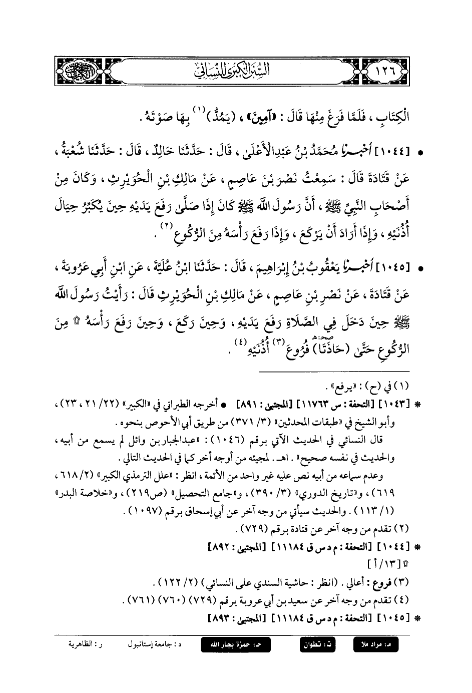 1045- أَخبَرنا يَعقُوبُ بنُ إِبرَاهِيمَ، قَالَ: حَدثنا ابنُ عُلَيَّةَ، عَنِ ابنِ أَبي عَرُوبَةَ، عَن قَتَادَةَ، عَن نَصْرِ بنِ عَاصِمٍ، عَن مَالِكِ بنِ الحُوَيْرِثِ قَالَ: رَأَيْتُ رَسُولَ اللهِ صَلى الله عَليه وسَلم حِينَ دَخَلَ فِي الصَّلاةِ رَفَعَ يَدَيْهِ، وَحِينَ رَكَعَ، وَحِينَ رَفَعَ رَأْسَهُ مِنَ الرُّكُوعِ، حَتَّى حَاذَتَا فُرُوعَ أُذُنَيْهِ.