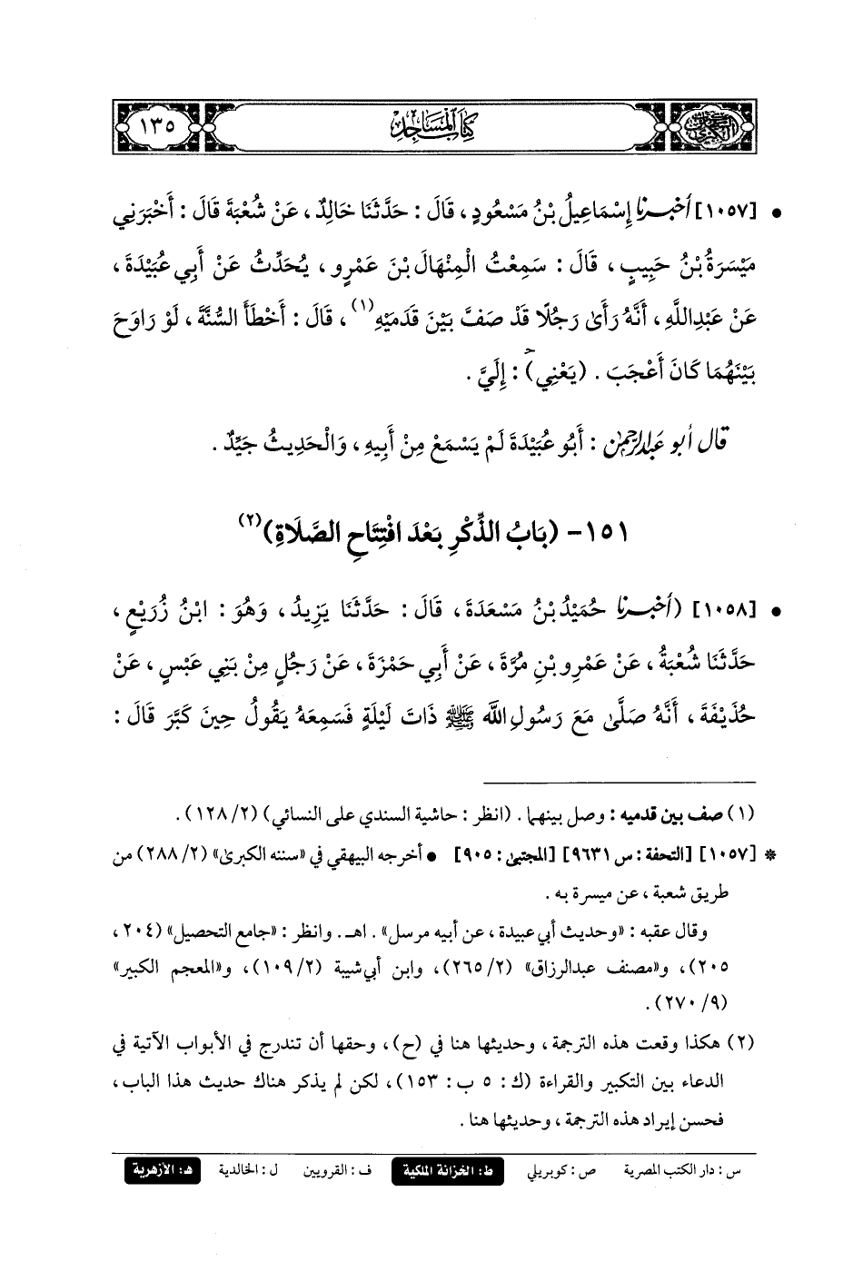 1057- أَخبَرنا إِسمَاعِيلُ بنُ مَسْعُودٍ، قَالَ: حَدثنا خَالِدٌ، عَن شُعبَةَ، قَالَ: أَخبَرني مَيْسَرَةُ بنُ حَبِيبٍ، قَالَ: سَمِعْتُ المِنْهَالَ بْنَ عَمْرٍو يُحَدِّثُ عَن أَبي عُبَيدَةَ، عَن عَبدِ اللهِ، أَنَّهُ رَأَى رَجُلاً قَدْ صَفَّ بَيْنَ قَدَمَيْهِ، قَالَ: أَخْطَأَ السُّنَةَ، وَلَوْ رَاوَحَ بَيْنَهُمَا كَانَ أَعْجَبَ يعني إِلَيَّ.