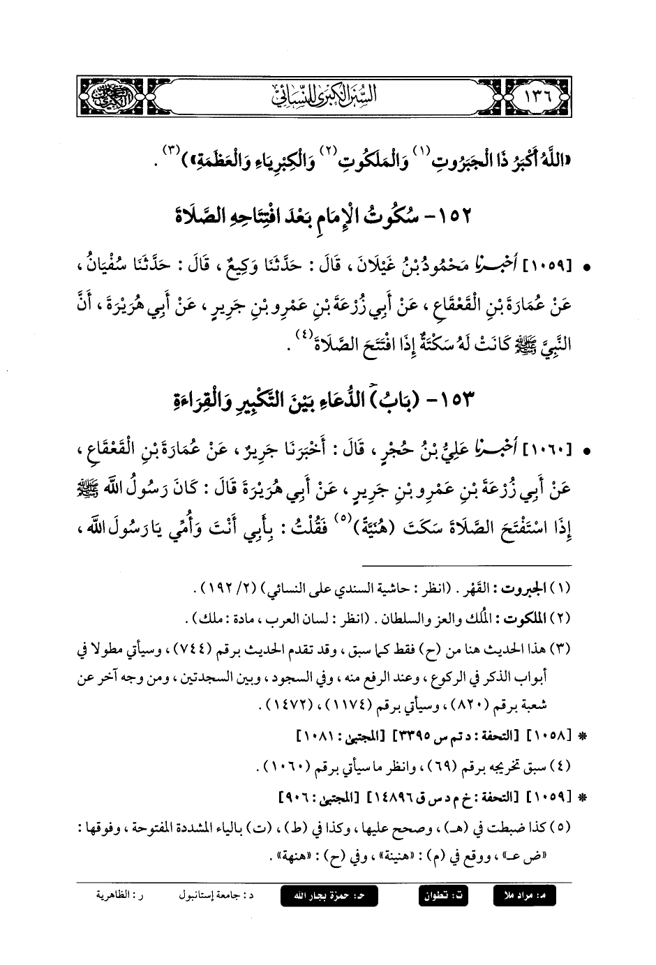 1059- أَخبَرنا مَحْمُودُ بنُ غَيْلانَ، قَالَ: حَدثنا وَكِيعٌ، قَالَ: حَدثنا سُفيانُ، عَن عُمَارَةَ بنِ القَعْقَاعِ، عَن أَبي زُرْعَةَ بنِ عَمْرِو بنِ جَرِيرٍ، عَن أَبي هُرَيرَةَ، أَنَّ النَّبيَّ صَلى الله عَليه وسَلم كَانَتْ لَهُ سَكْتَةٌ إِذَا افْتَتَحَ الصَّلاةَ.