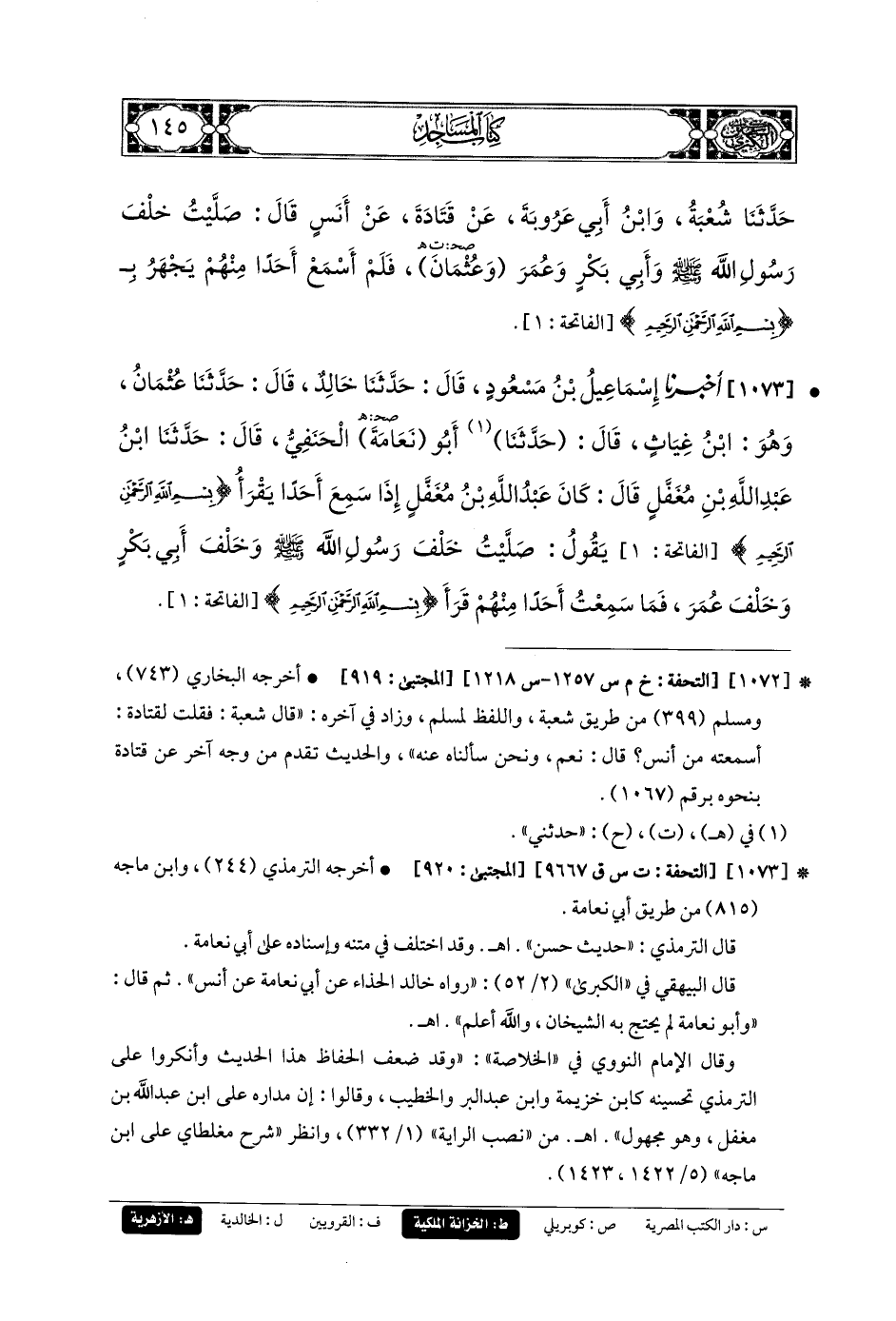 1073- أَخبَرنا إِسمَاعِيلُ بنُ مَسْعُودٍ، قَالَ: حَدثنا خَالِدٌ، قَالَ: حَدثنا عُثْمَانُ، وَهُوَ ابنُ غِيَاثٍ، قَالَ: حَدثنا أَبو نَعَامَةَ الحَنَفِيُّ، قَالَ: حَدثنا ابنُ عَبدِ اللهِ بنِ مُغَفَّلٍ قَالَ: كَانَ عَبدُ اللهِ بنُ مُغَفَّلٍ، إِذَا سَمِعَ أَحَدًا يَقْرَأُ: {بِسْمِ اللهِ الرَّحمَنِ الرَّحِيمِ}، يَقُولُ: صَلَّيْتُ خَلْفَ رَسُولِ اللهِ صَلى الله عَليه وسَلم، وَخَلْفَ أَبي بَكْرٍ، وَخَلْفَ عُمَرَ، فَمَا سَمِعْتُ أَحَدًا مِنْهُمْ قَرَأَ: {بِسْمِ اللهِ الرَّحمَنِ الرَّحِيمِ}.
