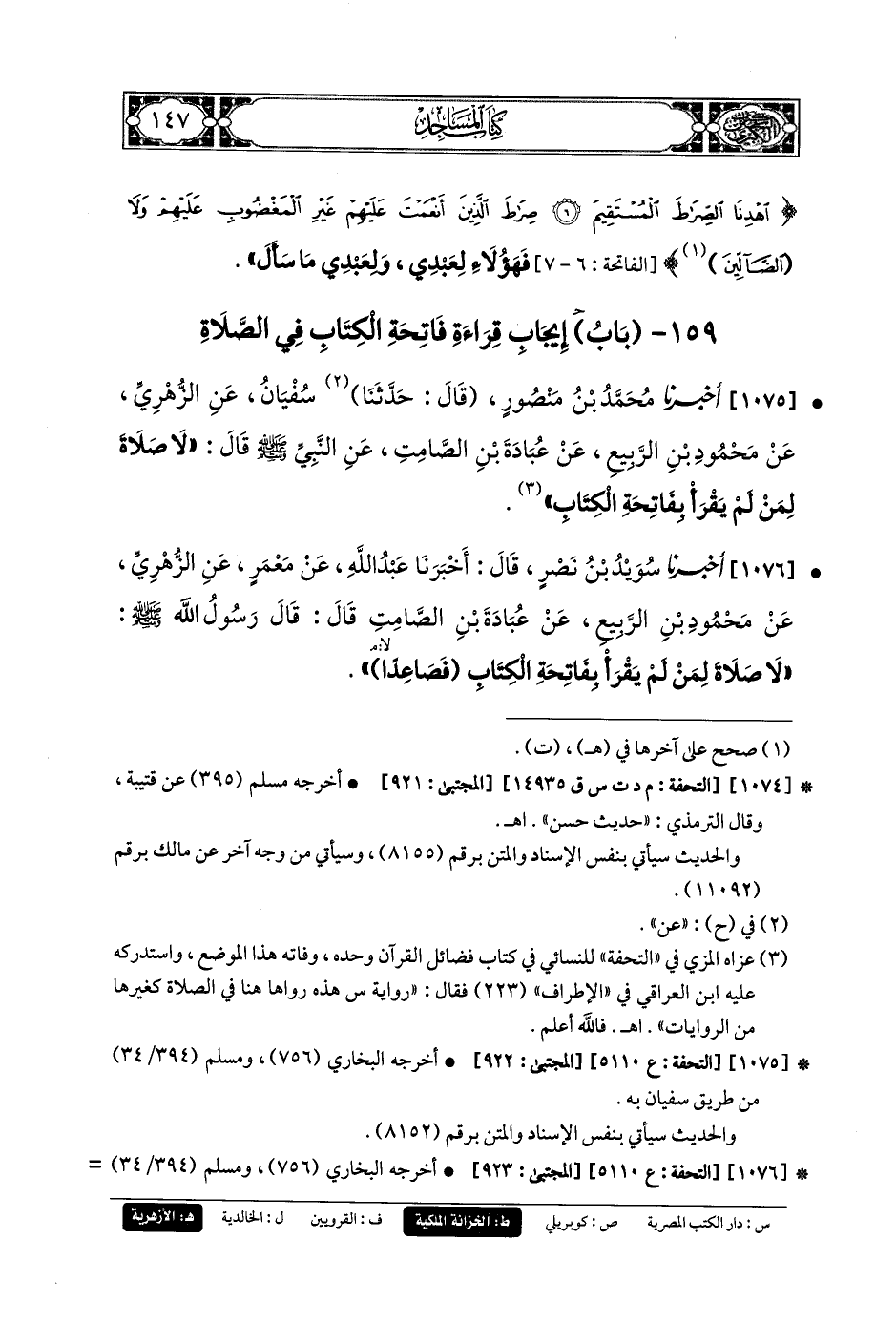 159 - باب إِيجَابُ قِرَاءَةُ فَاتِحَةِ الكِتَابِ فِي الصَّلاةِ.