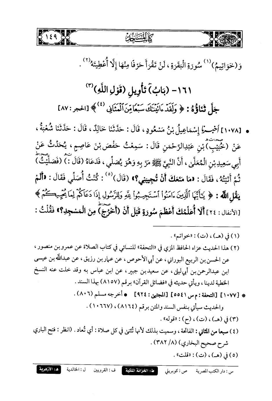 161- باب تَأْوِيلُ قَوْلِ اللهِ جَلَّ ثَنَاؤُهُ: {وَلَقَدْ آتَيْنَاكَ سَبْعًا مِنَ المَثَانِي}.