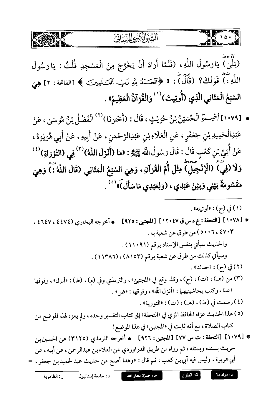 1079- أَخبَرنا الحُسَيْنُ بنُ حُرَيْثٍ، قَالَ: أَخبَرنا الفَضْلُ بنُ مُوسَى، عَن عَبدِ الحَمِيدِ بنِ جَعفَرٍ، عَنِ العَلاءِ بنِ عَبدِ الرَّحمَنِ، عَن أَبيهِ، عَن أَبي هُرَيرَةَ، عَن أُبَيِّ بنِ كَعْبٍ، قَالَ: قَالَ رَسُولُ اللهِ صَلى الله عَليه وسَلم: مَا أَنْزَلَ اللهُ فِي التَّوْرَاةِ وَلا فِي الإِنْجِيلِ مِثْلَ أُمِّ القُرْآنِ وَهِيَ السَّبْعُ المَثَانِي، قَالَ اللهُ: وَهِيَ مَقْسُومَةٌ بَيْنِي وَبَيْنَ عَبدِي وَلِعَبدِي مَا سَأَلَ.