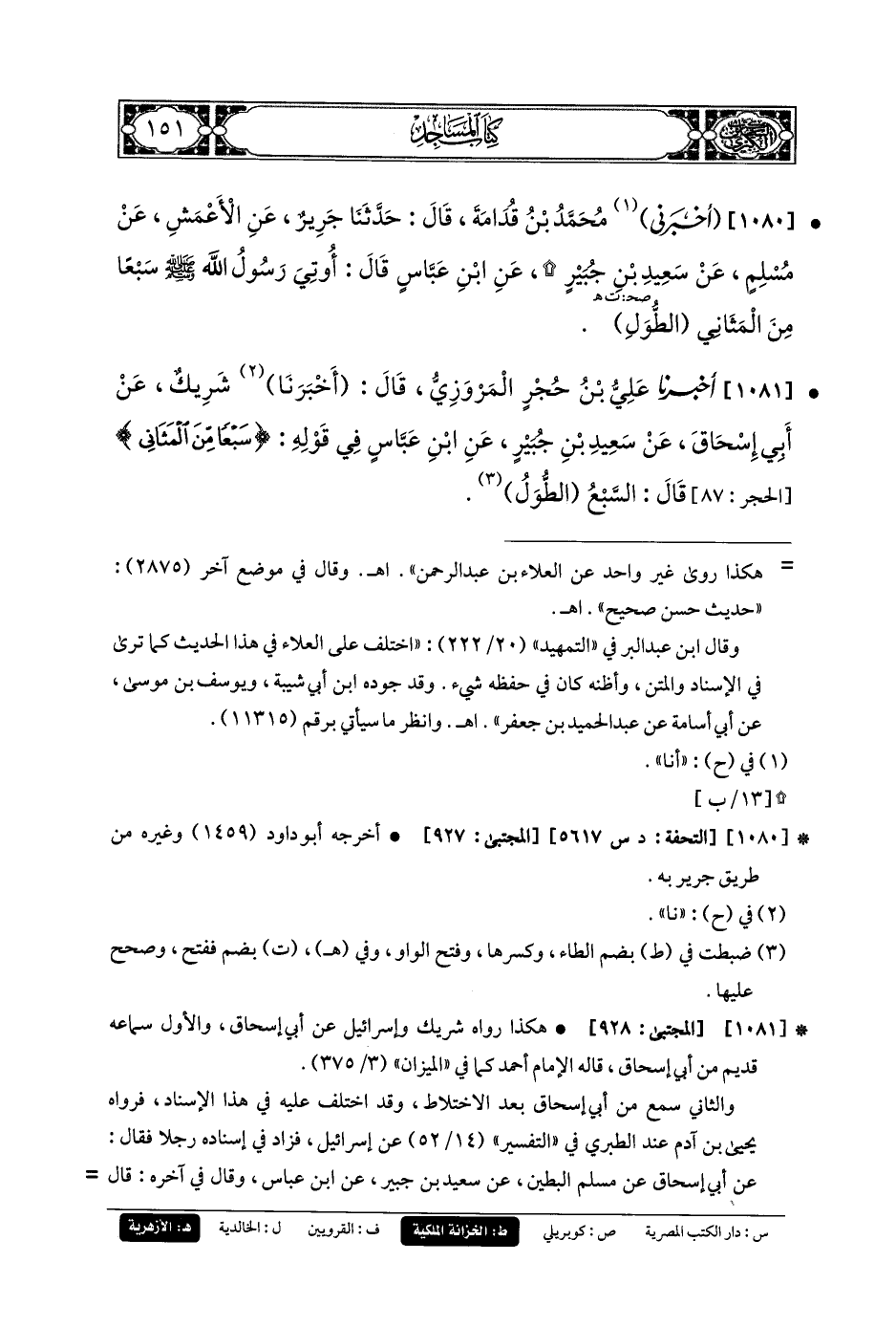 1081- أَخبَرنا عَليُّ بنُ حُجْرٍ المَرْوَزِيُّ، قَالَ: أَخبَرنا شَرِيكٌ، عَن أَبي إِسحَاقَ، عَن سَعِيدِ بنِ جُبَيرٍ، عَنِ ابنِ عَبَّاسٍ، فِي قَوْلِهِ: {سَبْعًا مِنَ المَثَانِي}، قَالَ: السَّبْعُ الطُّوَلُ.