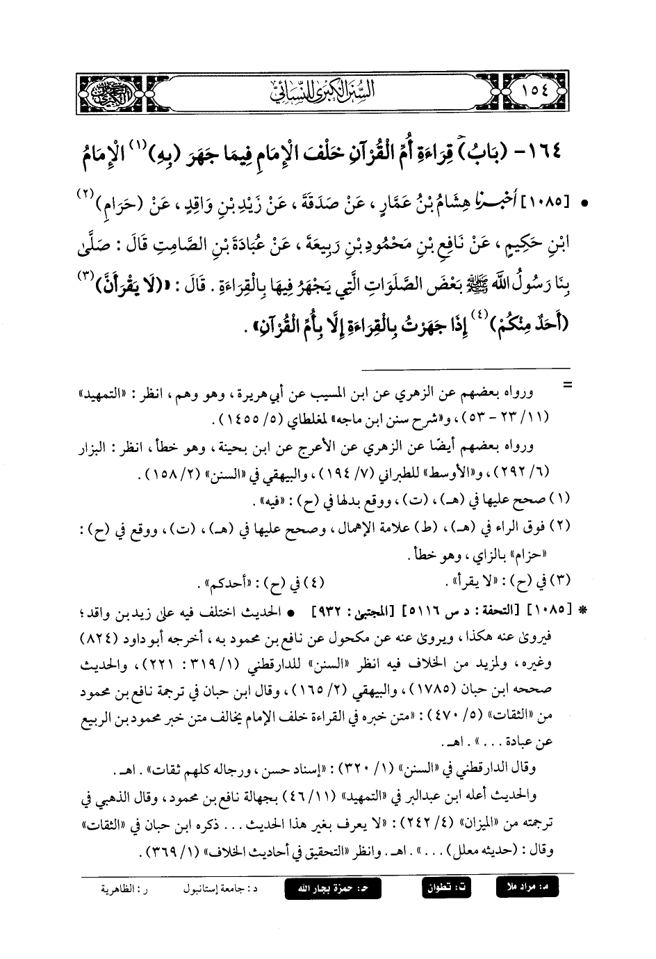 1085- أَخبَرنا هِشَامُ بنُ عَمَّارٍ، عَن صَدَقَةَ، عَن زَيْدِ بنِ وَاقِدٍ، عَن حَرَامِ بنِ حَكِيمٍ، عَن نَافِعِ بنِ مَحْمُودِ بنِ رَبِيعَةَ، عَن عُبَادَةَ بنِ الصَّامِتِ، قَالَ: صَلَّى بِنَا رَسُولُ اللهِ صَلى الله عَليه وسَلم بَعْضَ الصَّلَوَاتِ الَّتِي يُجْهَرُ فِيهَا بِالقِرَاءَةِ، قَالَ: لا يَقْرَأَنَّ أَحَدٌ مِنْكُمْ إِذَا جَهَرْتُ بِالقِرَاءَةِ إِلاَّ بِأُمِّ القُرْآنِ.