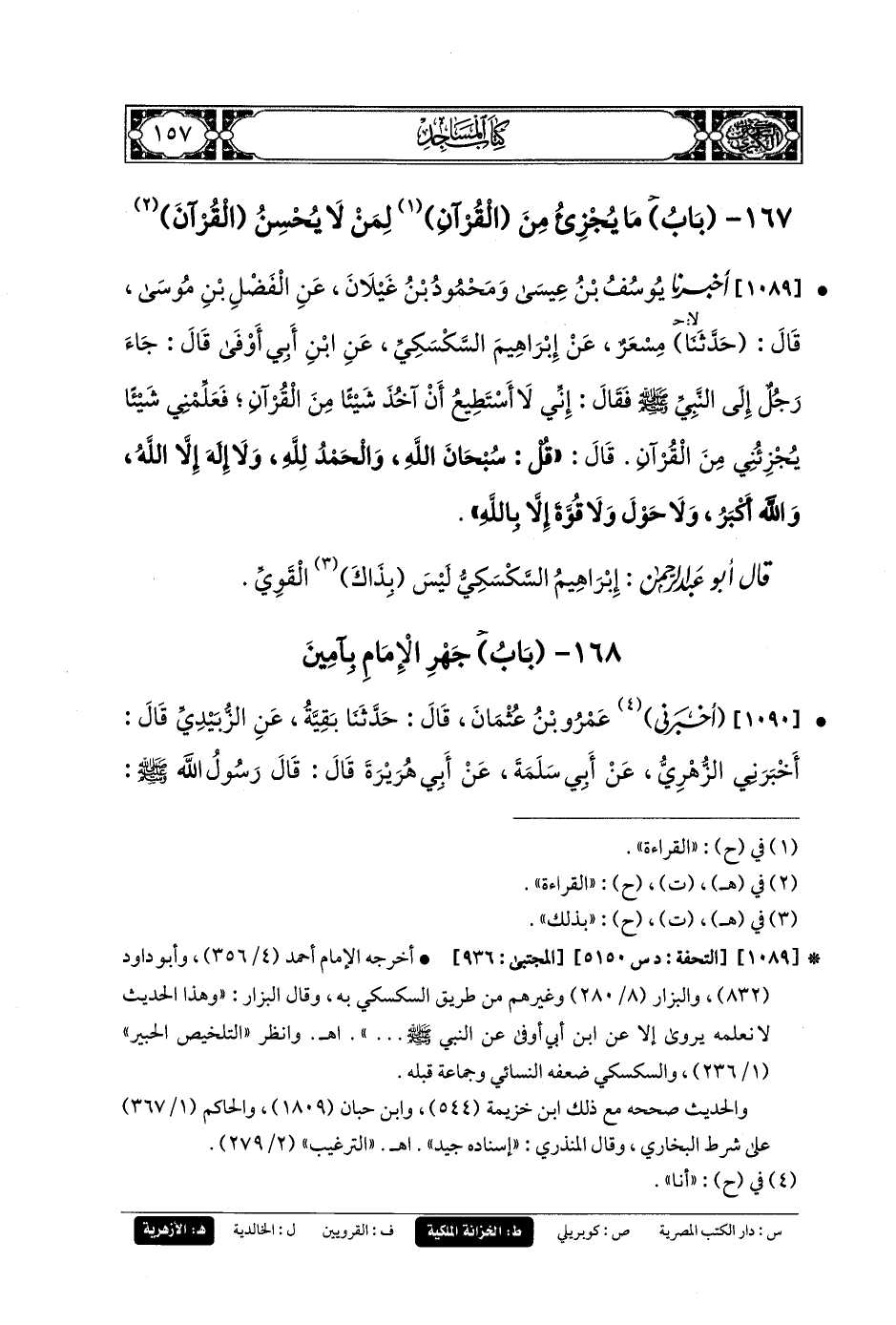 1089- أَخبَرنا يُوسُفُ بنُ عِيسَى، وَمَحْمُودُ بنُ غَيْلانَ، عَنِ الفَضْلِ بنِ مُوسَى، قَالَ: حَدثنا مِسْعَرُ، عَن إِبرَاهِيمَ السَّكْسَكِيِّ، عَنِ ابنِ أَبي أَوْفَى، قَالَ: جَاءَ رَجُلٌ إِلَى النَّبيِّ صَلى الله عَليه وسَلم، فَقَالَ: إِنِّي لا أَسْتَطِيعُ أَنْ آخُذَ شَيْئًا مِنَ القُرْآنِ، فَعَلِّمْنِي شَيْئًا يُجْزِئُنِي مِنَ القُرْآنِ، قَالَ: قُلْ: سُبْحَانَ اللهِ، وَالحَمْدُ للهِ، وَلا إِلَهَ إِلاَّ اللهُ، وَاللهُ أَكْبَرُ، وَلا حَوْلَ وَلا قُوَّةَ إِلاَّ بِاللَّهِ.