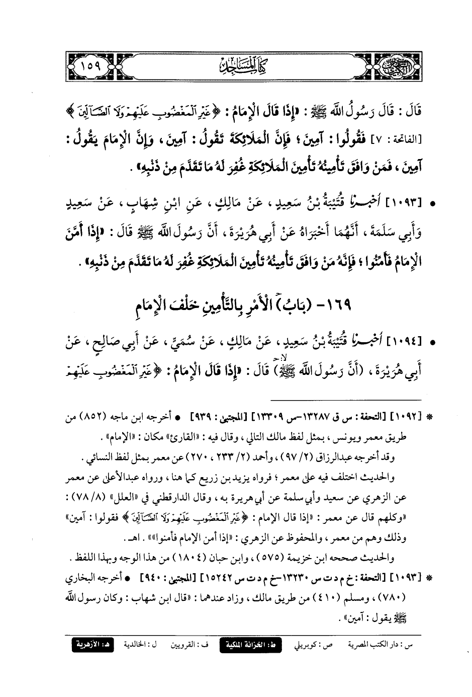 1093- أَخبَرنا قُتَيبَةُ بنُ سَعِيدٍ، عَن مَالِكٍ، عَنِ ابنِ شِهَابٍ، عَن سَعِيدٍ، وَأَبي سَلَمَةَ، أَنَّهُمَا أَخبَرَاهُ عَن أَبي هُرَيرَةَ، أَنَّ رَسُولَ اللهِ صَلى الله عَليه وسَلم قَالَ: إِذَا أَمَّنَ الإِمَامُ فَأَمِّنُوا، فَإِنَّهُ مَنْ وَافَقَ تَأْمِينُهُ تَأْمِينَ المَلائِكَةِ، غُفِرَ لَهُ مَا تَقَدَّمَ مِنْ ذَنْبِهِ.