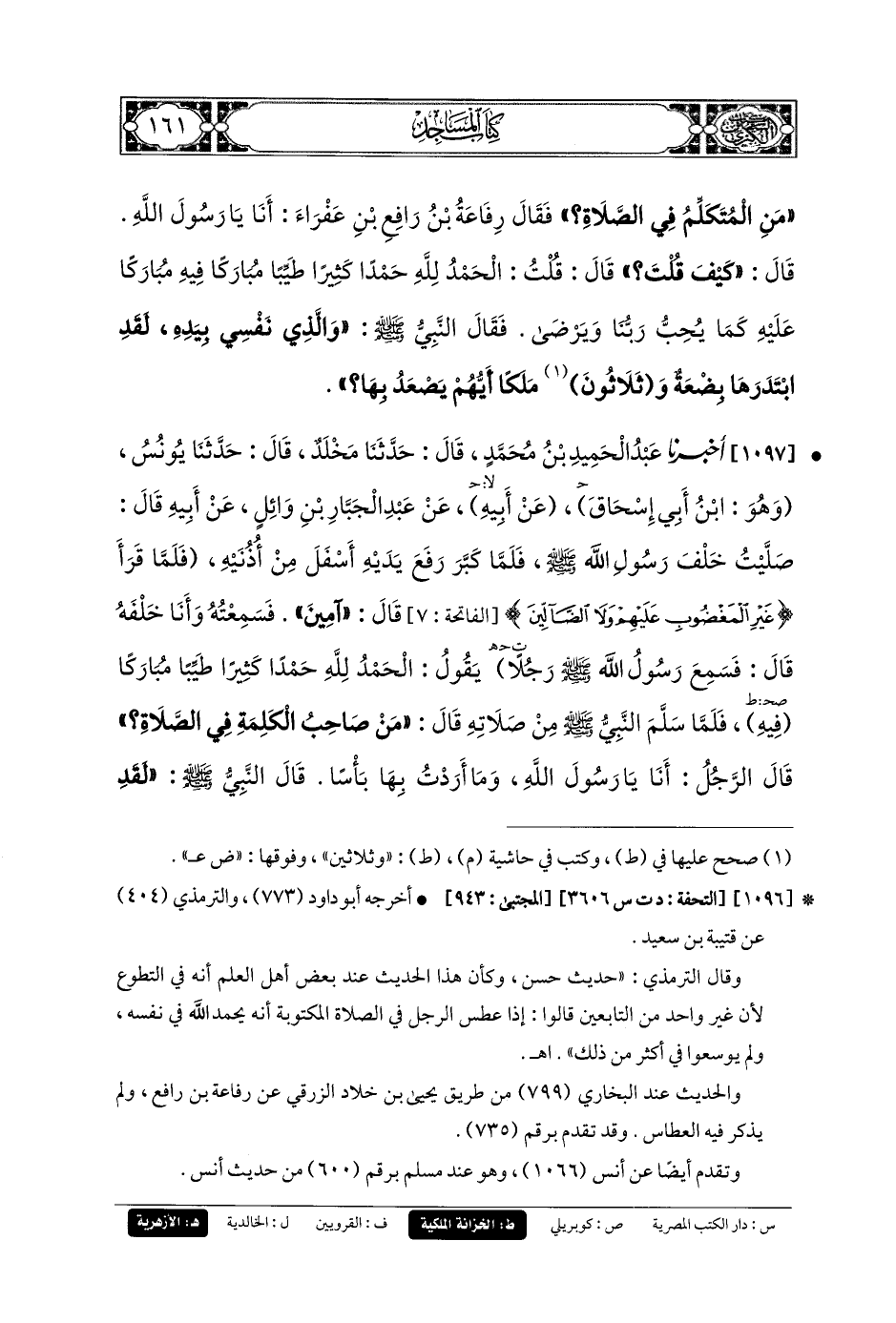 1097- أَخبَرنا عَبدُ الحَمِيدِ بنِ مُحَمدٍ، قَالَ: حَدثنا مَخْلَدٌ، قَالَ: حَدثنا يُونُسُ وهو ابن أبي إسحاق، عَن أَبيهِ، عَن عَبدِ الجَبَّارِ بنِ وَائِلٍ، عَن أَبيهِ، قَالَ: صَلَّيْتُ خَلْفَ رَسُولِ اللهِ صَلى الله عَليه وسَلم، فَلَمَّا كَبَّرَ رَفَعَ يَدَيْهِ أَسْفَلَ مِنْ أُذُنَيْهِ، فَلَمَّا قَرَأَ: {غَيْرِ المَغْضُوبِ عَلَيْهِمْ وَلا الضَّالِّينَ} قَالَ: آمِينَ، فَسَمِعْتُهُ وَأَنَا خَلْفَهُ، قَالَ: فَسَمِعَ رَسُولُ اللهِ صَلى الله عَليه وسَلم رَجُلاً يَقُولُ: الحَمْدُ للهِ حَمْدًا كَثِيرًا طَيِّبًا مُبَارَكًا فِيهِ، فَلَمَّا سَلَّمَ النَّبيُّ صَلى الله عَليه وسَلم مِنْ صَلاتِهِ، قَالَ: مَنْ صَاحِبُ الكَلِمَةِ فِي الصَّلاةِ؟ قَالَ الرَّجُلُ: أَنَا يَا رَسُولَ اللهِ، وَمَا أَرَدْتُ بِهَا بَأَسًا، قَالَ النَّبيُّ صَلى الله عَليه وسَلم: لَقَدِ ابْتَدَرَهَا اثْنَا عَشَرَ مَلَكًا، فَمَا نَهْنَهَهَا شَيْءٌ دُونَ العَرْشِ.