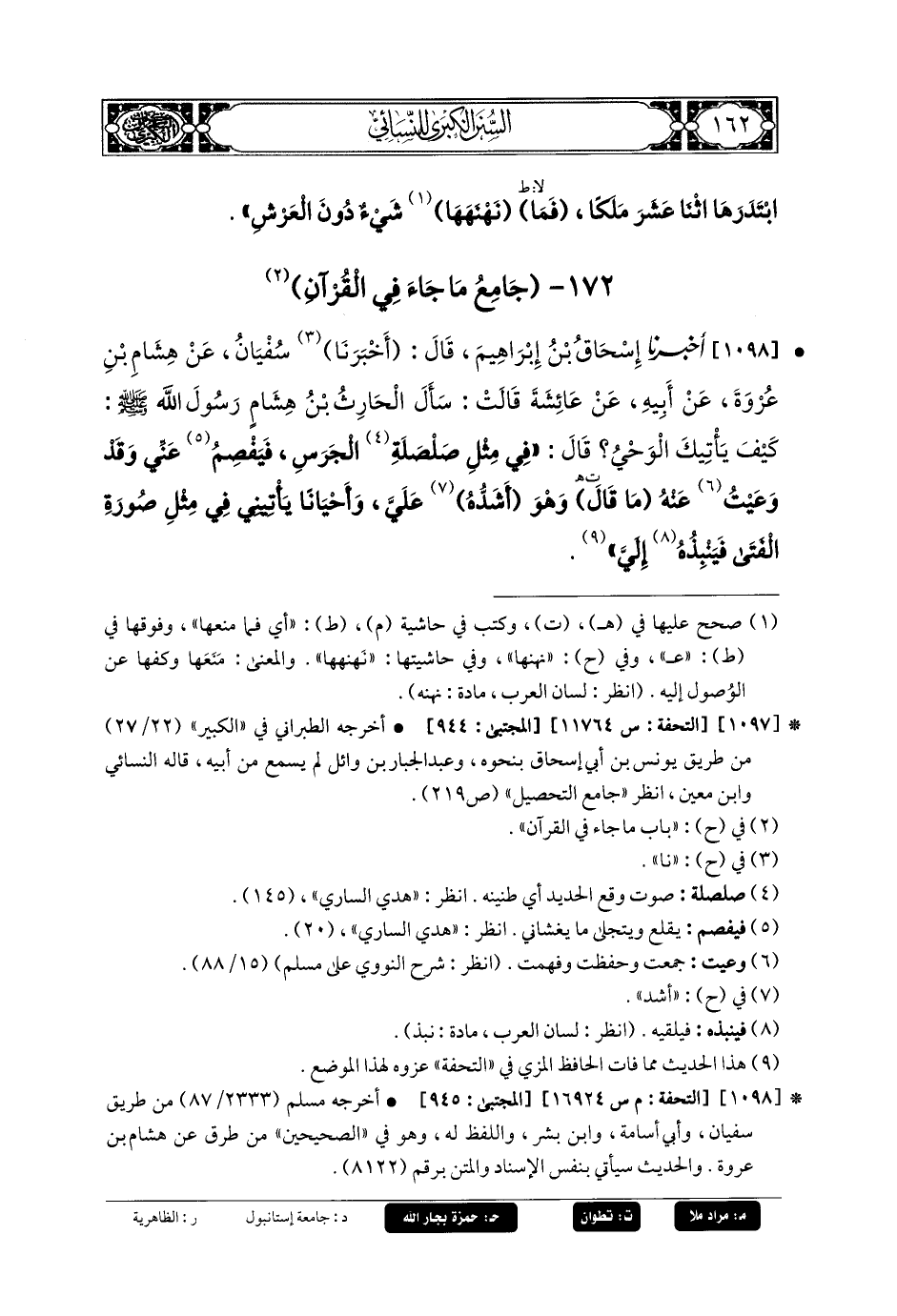 1098- أَخبَرنا إِسحَاقُ بنُ إِبرَاهِيمَ، قَالَ: أَخبَرنا سُفيانُ، عَن هِشَامِ بنِ عُرْوَةَ، عَن أَبيهِ، عَن عَائِشَةَ، قَالَتْ: سَأَلَ الحَارِثُ بنُ هِشَامٍ رَسُولَ اللهِ صَلى الله عَليه وسَلم، كَيْفَ يَأْتِيكَ الوَحْيُ؟ قَالَ: فِي مِثْلِ صَلْصَلَةِ الجَرَسِ، فَيَفْصِمُ عَنِّي وَقَدْ وَعِيتُ عَنهُ مَا قَالَ: وَهُوَ أَشَدُّهُ عَلَيَّ، وَأَحْيَانًا يَأْتِينِي فِي مِثْلِ صُورَةِ الفَتَى فَيَنْبِذُهُ إِلَيَّ.
