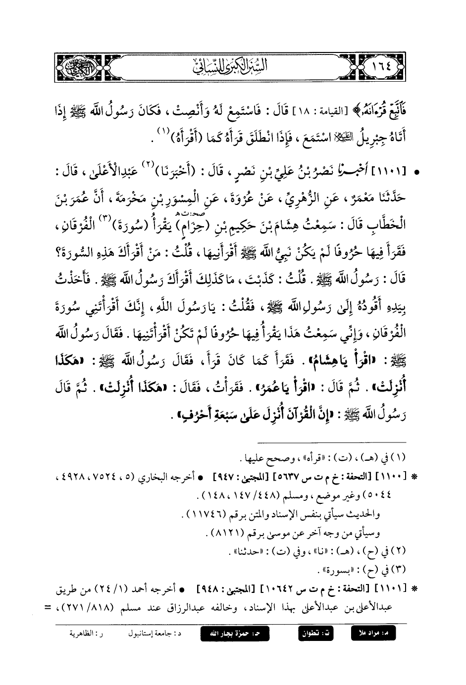 1101- أَخبَرنا نَصْرُ بنُ عَليِّ بنِ نَصْرٍ، قَالَ: أَخبَرنا عَبدُ الأَعْلَى، قَالَ: حَدثنا مَعْمَرٌ، عَنِ الزُّهْرِيِّ، عَن عُرْوَةَ، عَنِ المِسْوَرِ بنِ مَخْرَمَةَ، أَنَّ عُمَرَ بْنَ الخَطَّابِ، قَالَ: سَمِعْتُ هِشَامَ بْنَ حَكِيمِ بنِ حِزَامٍ يَقْرَأُ سُورَةَ الفُرْقَانِ، فَقَرَأَ فِيهَا حُرُوفًا لَمْ يَكُنْ نَبِيُّ اللهِ صَلى الله عَليه وسَلم أَقْرَأَنِيهَا، قُلْتُ: مَنْ أَقْرَأَكَ هَذِهِ السُّورَةَ؟ قَالَ: رَسُولُ اللهِ صَلى الله عَليه وسَلم، قُلْتُ: كَذَبْتَ، مَا كَذَلِكَ أَقْرَأَكَ رَسُولُ اللهِ صَلى الله عَليه وسَلم، فَأَخَذْتُ بِيَدِهِ أَقُودُهُ إِلَى رَسُولِ اللهِ صَلى الله عَليه وسَلم، فَقُلْتُ: يَا رَسُولَ اللهِ، إِنَّكَ أَقْرَأْتَنِي سُورَةَ الفُرْقَانِ، وَإِنِّي سَمِعْتُ هَذَا يَقْرَأُ فِيهَا حُرُوفًا لَمْ تَكُنْ أَقْرَأْتَنِيهَا؟ فَقَالَ رَسُولُ اللهِ صَلى الله عَليه وسَلم: اقْرَأْ يَا هِشَامُ، فَقَرَأَ كَمَا كَانَ قَرَأَ، فَقَالَ رَسُولُ اللهِ صَلى الله عَليه وسَلم: هَكَذَا أُنْزِلَتْ، ثُمَّ قَالَ: اقْرَأْ يَا عُمَرُ، فَقَرَأْتُ، فَقَالَ: هَكَذَا أُنْزِلَتْ، ثُمَّ قَالَ رَسُولُ اللهِ صَلى الله عَليه وسَلم: إِنَّ القُرْآنَ أُنْزِلَ عَلَى سَبْعَةِ أَحْرُفٍ.