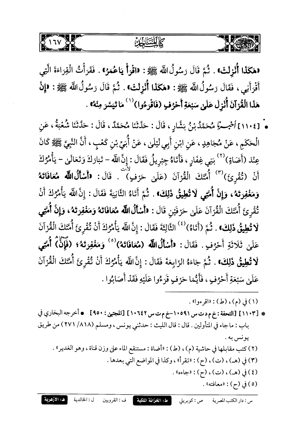 1104- أَخبَرنا مُحَمدُ بنُ بَشَّارٍ، قَالَ: حَدثنا مُحَمدٌ، قَالَ: حَدثنا شُعبَةُ، عَنِ الحَكَمِ، عَن مُجَاهِدٍ، عَنِ ابنِ أَبي لَيْلَى، عَن أُبَيِّ بنِ كَعْبٍ، أَنَّ النَّبيَّ صَلى الله عَليه وسَلم كَانَ عِنْدَ أَضَاةِ بَنِي غِفَارٍ، فَأَتَاهُ جِبْرِيلُ، فَقَالَ: إِنَّ اللهَ تبارك وتعالى يَأْمُرُكَ أَنْ تُقْرِئَ أُمَّتَكَ القُرْآنَ عَلَى حَرْفٍ، قَالَ: أَسْأَلُ اللهَ مُعَافَاتَهُ، وَمَغْفِرَتَهُ، وَإِنَّ أُمَّتِي لا تُطِيقُ ذَلِكَ، ثُمَّ أَتَاهُ الثَّانِيَةَ، فَقَالَ: إِنَّ اللهَ يَأْمُرُكَ أَنْ تُقْرِئَ أُمَّتَكَ القُرْآنَ عَلَى حَرْفَيْنِ، قَالَ: أَسْأَلُ اللهَ مُعَافَاتَهُ، وَمَغْفِرَتَهُ، وَإِنَّ أُمَّتِي لا تُطِيقُ ذَلِكَ، ثُمَّ أَتَاهُ الثَّالِثَةَ، فَقَالَ: إِنَّ اللهَ يَأْمُرُكَ أَنْ تُقْرِئَ أُمَّتَكَ القُرْآنَ عَلَى ثَلاثَةِ أَحْرُفٍ، قَالَ: أَسْأَلُ اللهَ مُعَافَاتَهُ، وَمَغْفِرَتَهُ، فَإِنَّ أُمَّتِي لا تُطِيقُ ذَلِكَ، ثُمَّ جَاءَهُ الرَّابِعَةَ، فَقَالَ: إِنَّ اللهَ يَأْمُرُكَ أَنْ تُقْرِئَ أُمَّتَكَ القُرْآنَ عَلَى سَبْعَةِ أَحْرُفٍ، فَأَيُّمَا حَرْفٍ قَرَؤُوا عَلَيْهِ فَقَدْ أَصَابُوا.