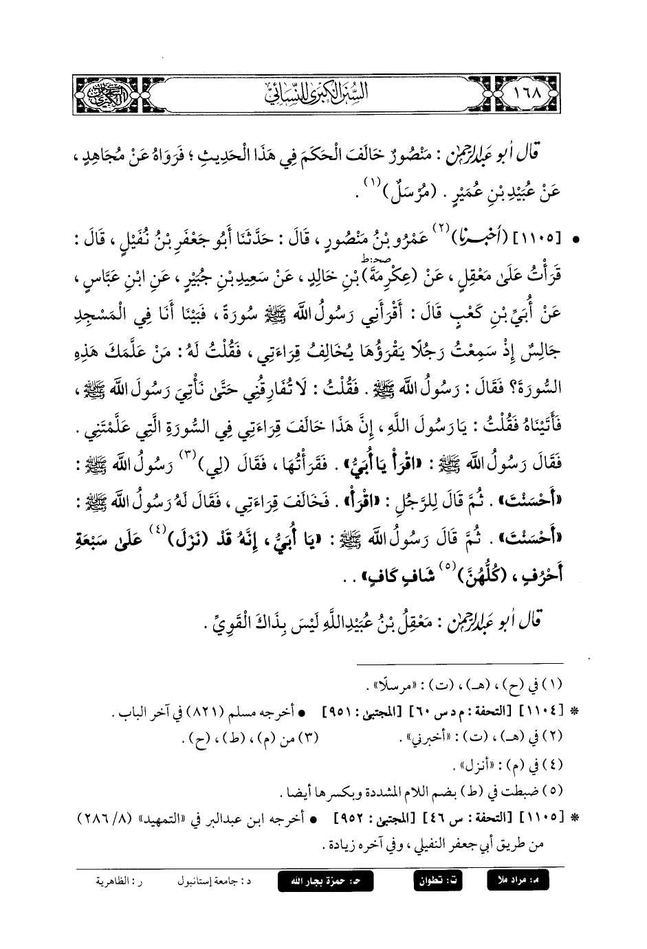 1105- أَخبَرنا عَمرُو بنُ مَنصُورٍ، قَالَ: حَدثنا أَبو جَعفَرِ بنِ نُفَيْلٍ، قَالَ: قَرَأْتُ عَلَى مَعْقِلٍ، عَن عِكْرِمَةَ بنِ خَالِدٍ، عَن سَعِيدِ بنِ جُبَيرٍ، عَنِ ابنِ عَبَّاسٍ، عَن أُبَيِّ بنِ كَعْبٍ قَالَ: أَقْرَأَنِي رَسُولُ اللهِ صَلى الله عَليه وسَلم سُورَةً، فَبَيْنَا أَنَا فِي المَسْجِدِ جَالِسٌ إِذْ سَمِعْتُ رَجُلاً يَقْرَؤُهَا يُخَالِفُ قِرَاءَتِي، فَقُلْتُ لَهُ: مَنْ عَلَّمَكَ هَذِهِ السُّورَةِ؟ فَقَالَ: رَسُولُ اللهِ صَلى الله عَليه وسَلم، فَقُلْتُ: لا تُفَارِقْنِي حَتَّى نَأْتِيَ رَسُولَ اللهِ صَلى الله عَليه وسَلم، فَأَتَيْنَاهُ، فَقُلْتُ: يَا رَسُولَ اللهِ، إِنَّ هَذَا خَالَفَ قِرَاءَتِي فِي السُّورَةِ الَّتِي عَلَّمْتَنِي، فَقَالَ رَسُولُ اللهِ صَلى الله عَليه وسَلم: اقْرَأْ يَا أُبَيُّ، فَقَرَأْتُهَا، فَقَالَ لِي رَسُولُ اللهِ صَلى الله عَليه وسَلم: أَحْسَنْتَ، ثُمَّ قَالَ لِلرَّجُلِ: اقْرَأْ، فَخَالَفَ قِرَاءَتِي، فَقَالَ لَهُ رَسُولُ اللهِ صَلى الله عَليه وسَلم: أَحْسَنْتَ، ثُمَّ قَالَ رَسُولُ اللهِ صَلى الله عَليه وسَلم: يَا أُبَيُّ إِنَّهُ قَدْ نزلَ عَلَى سَبْعَةِ أَحْرُفٍ كُلِّهِنَّ شَافٍ كَافٍ.