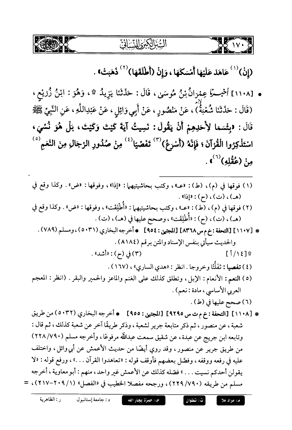 1108- أَخبَرنا عِمْرَانُ بنُ مُوسَى، قَالَ: أَخبَرنا يَزِيدُ، وَهُوَ ابنُ زُرَيْعٍ، قَالَ: حَدثنا شُعبَةُ، عَن مَنصُورٍ، عَن أَبي وَائِلٍ، عَن عَبدِ اللهِ، عَنِ النَّبيِّ صَلى الله عَليه وسَلم قَالَ: بِئْسَمَا لأَحَدِهِمْ أَنْ يَقُولَ: نَسِيتُ آيَةَ كَيْتَ وَكَيْتَ، بَلْ هُوَ نُسِّيَ، اسْتَذْكِرُوا القُرْآنَ، فَإِنَّهُ أَسْرَعُ تَفَصِّيًا مِنْ صُدُورِ الرِّجَالِ مِنَ النَّعَمِ مِنْ عُقُلِهِ.