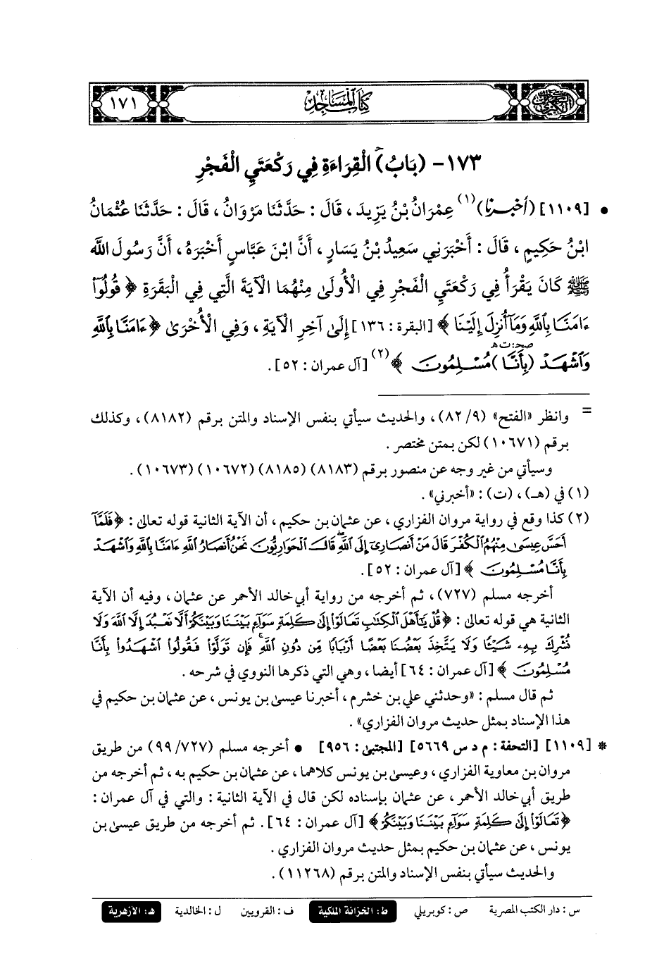 1109- أَخبَرنا عِمْرَانُ بنُ يَزِيدَ، قَالَ: حَدثنا مَرْوَانُ، قَالَ: حَدثنا عُثْمَانُ بنُ حَكِيمٍ، قَالَ: أَخبَرني سَعِيدُ بنُ يَسَارٍ، أَنَّ ابنَ عَبَّاسٍ أَخبَرَهُ؛ أَنَّ رَسُولَ اللهِ صَلى الله عَليه وسَلم كَانَ يَقْرَأُ فِي رَكْعَتَيِ الفَجْرِ فِي الأُولَى مِنْهُمَا الآيَةَ الَّتِي فِي البَقَرَةِ: {قُولُوا آمَنَّا بِاللهِ وَمَا أُنْزِلَ إِلَيْنَا} إِلَى آخِرِ الآيَةِ، وَفِي الأُخْرَى: {آمَنَّا بِاللهِ وَاشْهَدْ بِأَنَّا مُسْلِمُونَ}.