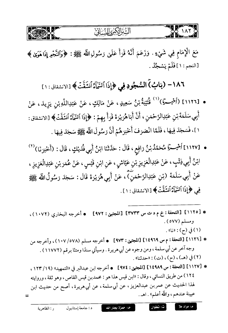1126- أَخبَرنا قُتَيبَةُ بنُ سَعِيدٍ، عَن مَالِكٍ، عَن عَبدِ اللهِ بنِ يَزِيدَ، عَن أَبي سَلَمَةَ بنِ عَبدِ الرَّحمَنِ، أَنَّ أَبَا هُرَيرَةَ قَرَأَ بِهِمْ: {إِذَا السَّمَاءُ انْشَقَّتْ} فَسَجَدَ فِيهَا، فَلَمَّا انْصَرَفَ، أَخبَرَهُمْ أَنَّ رَسُولَ اللهِ صَلى الله عَليه وسَلم سَجَدَ فِيهَا.
