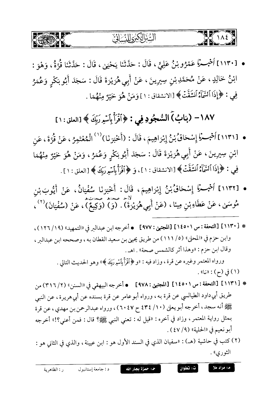 1130- أَخبَرنا عَمرُو بنُ عَليٍّ، قَالَ: حَدثنا يَحيَى، قَالَ: حَدثنا قُرَّةُ، وَهُوَ ابنُ خَالِدٍ، عَن مُحَمدِ بنِ سِيرِينَ، عَن أَبي هُرَيرَةَ قَالَ: سَجَدَ أَبو بَكْرٍ، وَعُمَرُ، فِي: {إِذَا السَّمَاءُ انْشَقَّتْ} وَمَنْ هُوَ خَيْرٌ مِنْهُمَا.