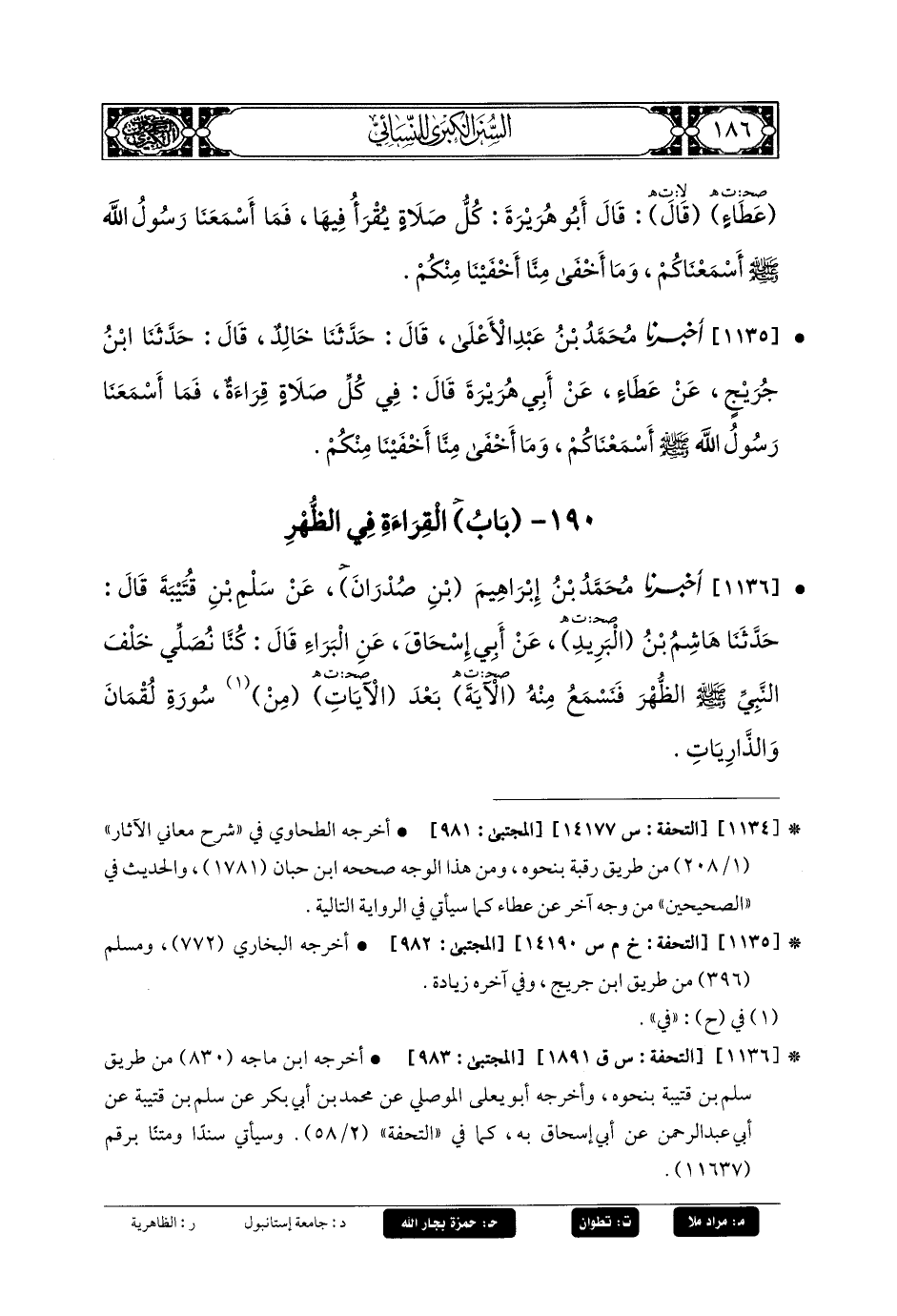 1136- أَخبَرنا مُحَمدُ بنُ إِبرَاهِيمَ بن صدران، عَن سَلْمِ بنِ قُتَيْبَةَ، قَالَ: حَدثنا هَاشِمُ بنُ البَرِيدِ، عَن أَبي إِسحَاقَ، عَنِ البَرَاءِ، قَالَ: كُنَّا نُصَلِّي خَلْفَ النَّبيِّ صَلى الله عَليه وسَلم الظُّهْرَ، فَنَسْمَعُ مِنْهُ الآيَةَ بَعْدَ الآيَاتِ مِنْ سُورَةِ لُقْمَانَ، وَالذَّارِيَاتِ.