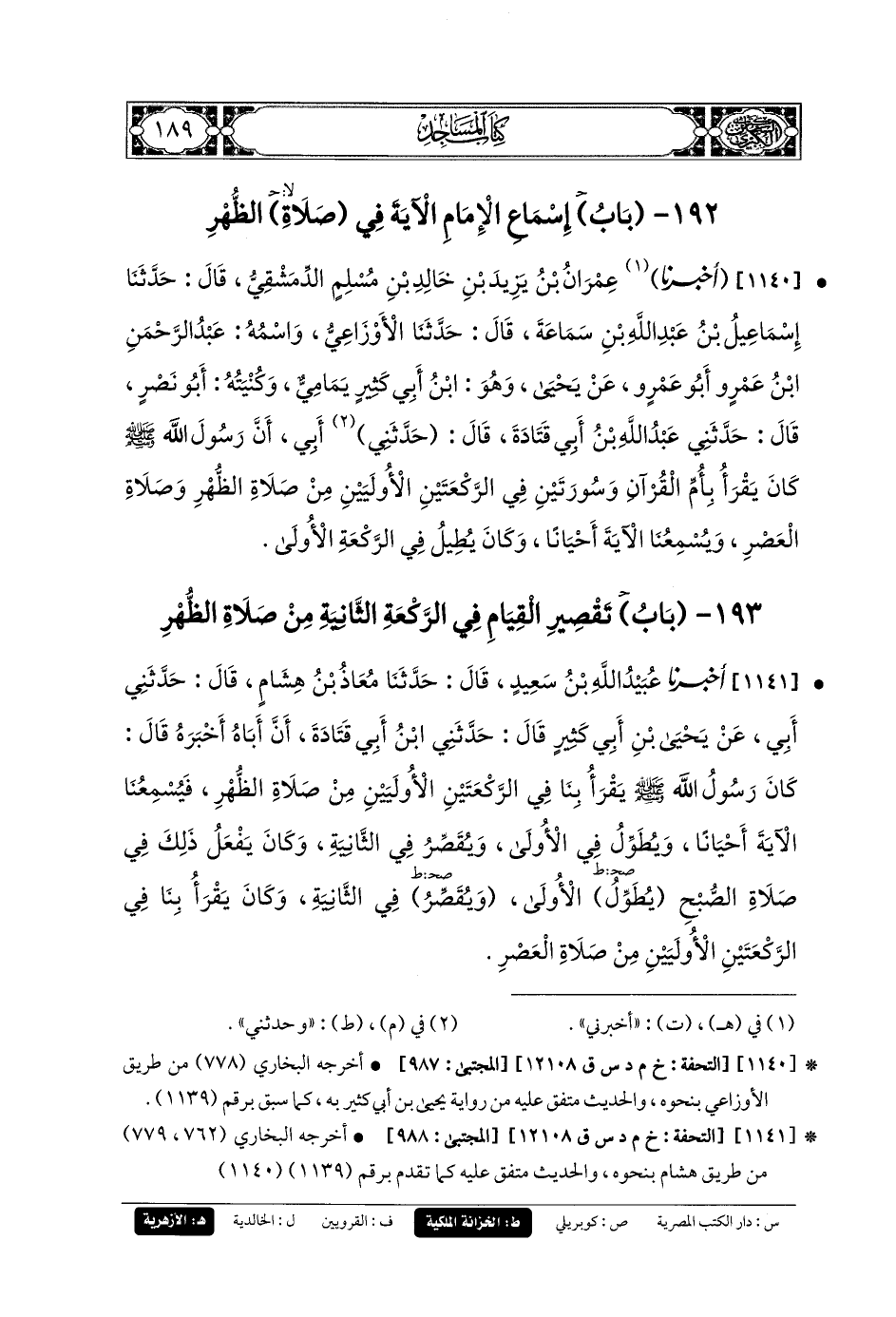 1140- أَخبَرنا عِمْرَانُ بنُ يَزِيدَ بنِ خَالِدِ بنِ مُسْلِمٍ الدِّمَشْقِيُّ، قَالَ: حَدثنا إِسمَاعِيلُ بنُ عَبدِ اللهِ بنِ سَمَاعَةَ، قَالَ: حَدثنا الأَوْزَاعِيُّ، وَاسْمُهُ عَبدُ الرَّحمَنِ بنُ عَمْرِو أَبو عَمْرٍو، عَن يَحيَى، وَهُوَ ابنُ أَبي كَثِيرٍ يَمَامِيٌّ وَكُنْيَتُهُ أَبو نَصْرٍ، قَالَ: حَدَّثني عَبدُ اللهِ بنُ أَبي قَتَادَةَ، قَالَ: حَدَّثني أَبي، أَنَّ رَسُولَ اللهِ صَلى الله عَليه وسَلم كَانَ يَقْرَأُ بِأُمِّ القُرْآنِ، وَسُورَتَيْنِ فِي الرَّكْعَتَيْنِ الأُولَيَيْنِ مِنْ صَلاةِ الظُّهْرِ، وَصَلاةِ العَصْرِ، وَيُسْمِعُنَا الآيَةَ أَحْيَانًا، وَكَانَ يُطِيلُ فِي الرَّكْعَةِ الأُولَى.
