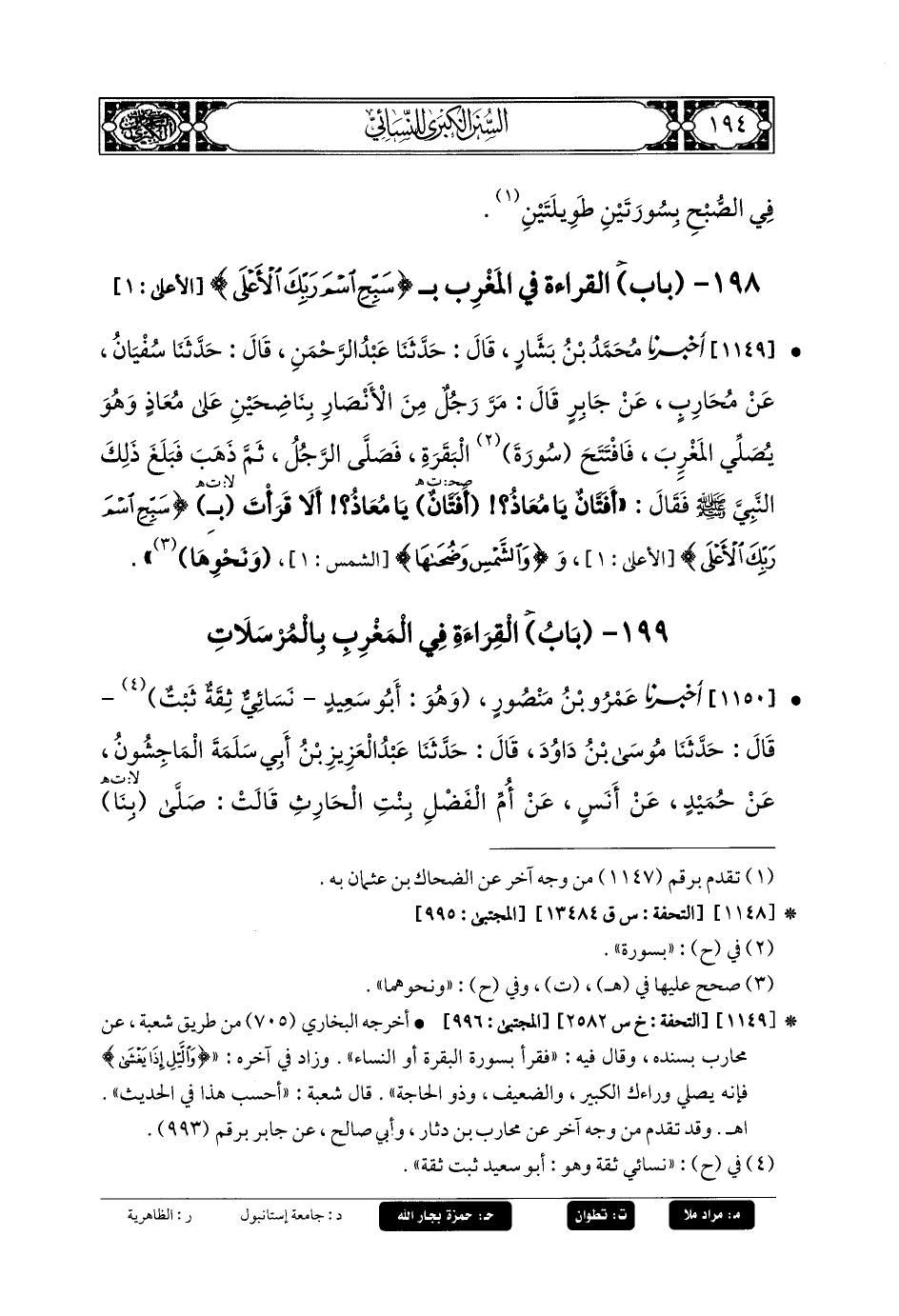 1149- أَخبَرنا مُحَمدُ بنُ بَشَّارٍ، قَالَ: حَدثنا عَبدُ الرَّحمَنِ، قَالَ: حَدثنا سُفيانُ، عَن مُحَارِبٍ، عَن جَابِرٍ، قَالَ: مَرَّ رَجُلٌ مِنَ الأَنْصَارِ بِنَاضِحَيْنِ عَلَى مُعَاذٍ وَهُوَ يُصَلِّي المَغْرِبَ، فَافْتَتَحَ سُورَةَ البَقَرَةِ، فَصَلَّى الرَّجُلُ، ثُمَّ ذَهَبَ، فَبَلَغَ ذَلِكَ النَّبيَّ صَلى الله عَليه وسَلم، فَقَالَ: أَفَتَّانٌ يَا مُعَاذُ، أَفَتَّانٌ يَا مُعَاذُ، أَلا قَرَأْتَ بِـ {سَبِّحِ اسْمَ رَبِّكَ الأَعْلَى}، وَ{وَالشَّمْسِ وَضُحَاهَا} وَنَحْوِهَا.