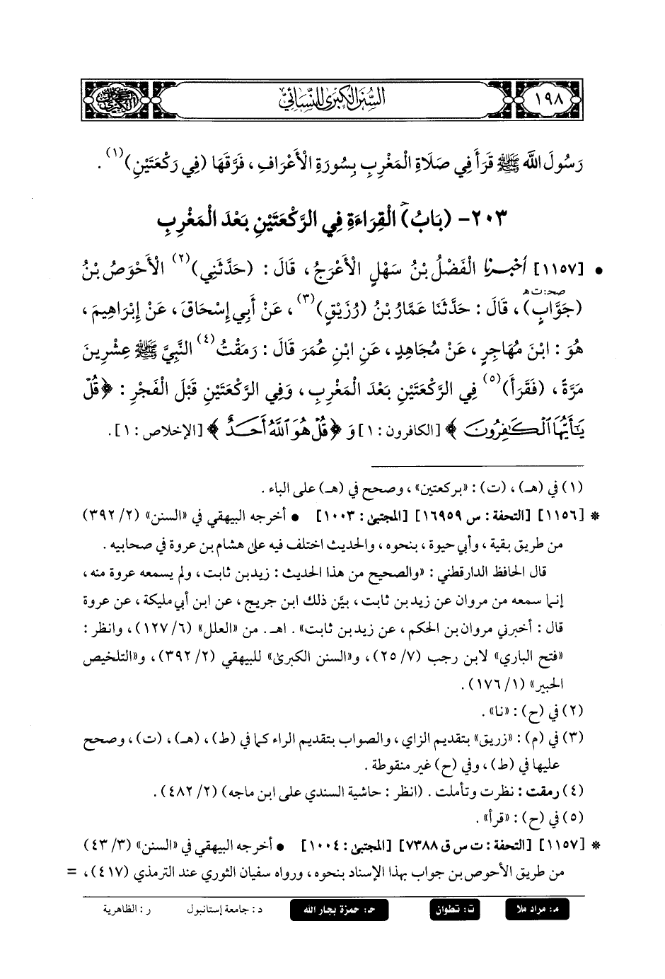 1157- أَخبَرنا الفَضْلُ بنُ سَهْلٍ الأَعْرَجُ، قَالَ: حَدَّثني الأَحْوَصُ بنُ جَوَّابٍ، قَالَ: حَدثنا عَمَّارُ بنُ رُزَيْقٍ، عَن أَبي إِسحَاقَ، عَن إِبرَاهِيمَ، هُوَ ابنُ مُهَاجِرٍ، عَن مُجَاهِدٍ، عَنِ ابنِ عُمَرَ قَالَ: رَمَقْتُ النَّبيَّ صَلى الله عَليه وسَلم عِشْرِينَ مَرَّةً، فَقَرَأَ فِي الرَّكْعَتَيْنِ بَعْدَ المَغْرِبِ وَفِي الرَّكْعَتَيْنِ قَبْلَ الفَجْرِ: {قُلْ يَا أَيُّهَا الكَافِرُونَ}، وَ{قُلْ هُوَ اللهُ أَحَدٌ}.