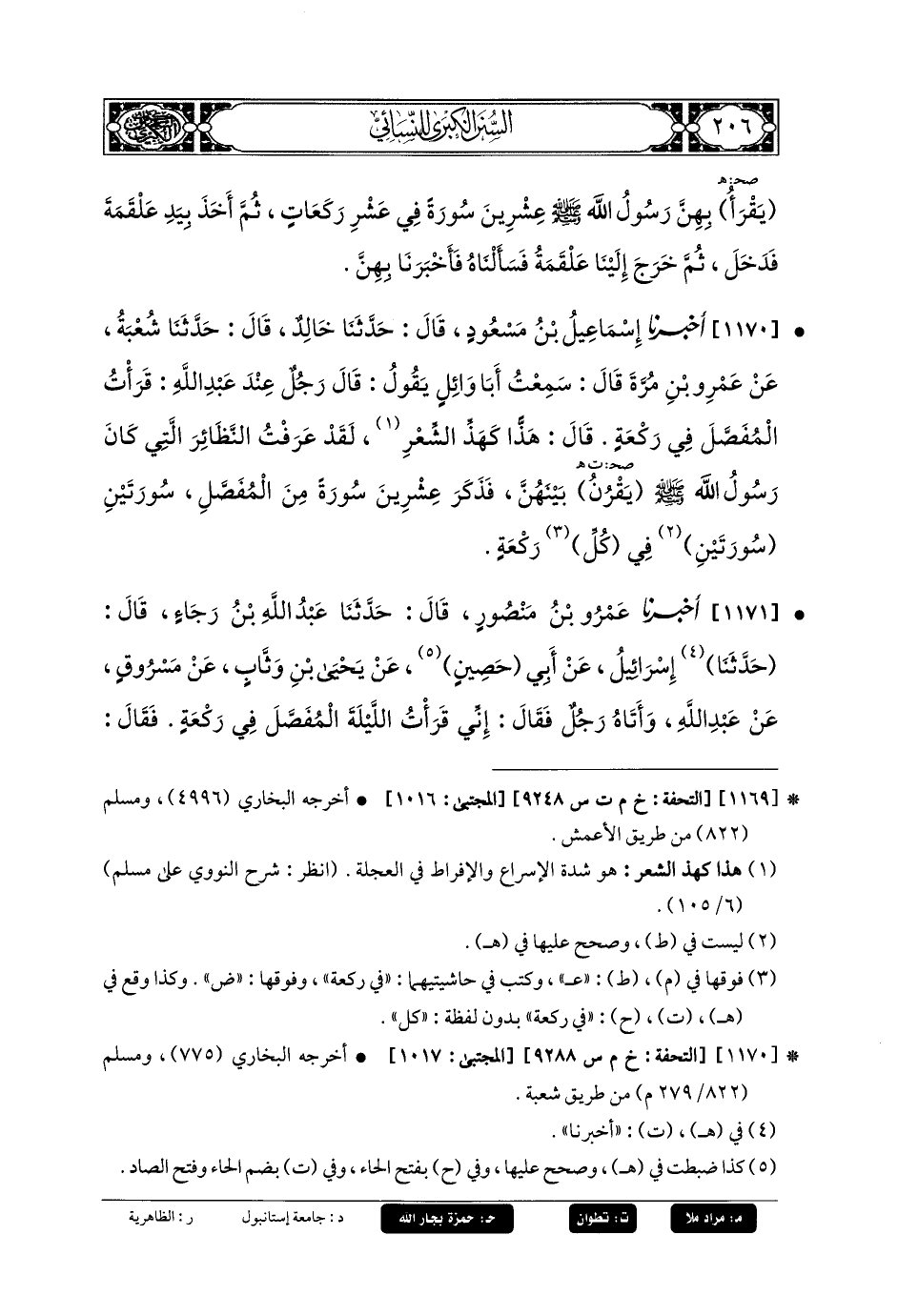 1170- أَخبَرنا إِسمَاعِيلُ بنُ مَسْعُودٍ، قَالَ: حَدثنا خَالِدٌ، قَالَ: حَدثنا شُعبَةُ، عَن عَمْرِو بنِ مُرَّةَ، قَالَ: سَمِعْتُ أَبَا وَائِلٍ يَقُولُ: قَالَ رَجُلٌ عِنْدَ عَبدِ اللهِ: قَرَأْتُ المُفَصَّلَ فِي رَكْعَةٍ، قَالَ: هَذًا كَهَذِّ الشِّعْرِ؟ لَقَدْ عَرَفْتُ النَّظَائِرَ الَّتِي كَانَ رَسُولُ اللهِ صَلى الله عَليه وسَلم يَقْرِنُ بَيْنَهُنَّ، فَذَكَرَ عِشْرِينَ سُورَةً مِنَ المُفَصَّلِ سُورَتَيْنِ سُورَتَيْنِ فِي كُلِّ رَكْعَةً.