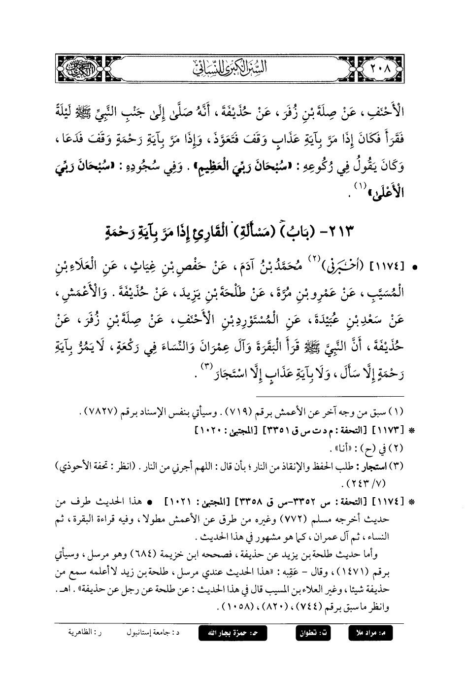 1174- أَخبَرني مُحَمدُ بنُ آدَمَ، عَن حَفْصِ بنِ غِيَاثٍ، عَنِ العَلاءِ بنِ المُسَيَّبِ، عَن عَمْرِو بنِ مُرَّةَ، عَن طَلحَةَ بنِ يَزِيدَ، عَن حُذَيْفَةَ، وَالأَعْمَشِ، عَن سَعْدِ بنِ عُبَيدَةَ، عَنِ المُسْتَوْرِدِ بنِ الأَحْنَفِ، عَن صِلَةَ بنِ زُفَرَ، عَن حُذَيْفَةَ، أَنَّ النَّبيَّ صَلى الله عَليه وسَلم قَرَأَ البَقَرَةَ وَآلَ عِمْرَانَ وَالنِّسَاءَ فِي رَكْعَةٍ، لا يَمُرُّ بِآيَةِ رَحْمَةٍ إِلاَّ سَأَلَ وَلا بِآيَةِ عَذَابٍ إِلاَّ اسْتَجَارَ.