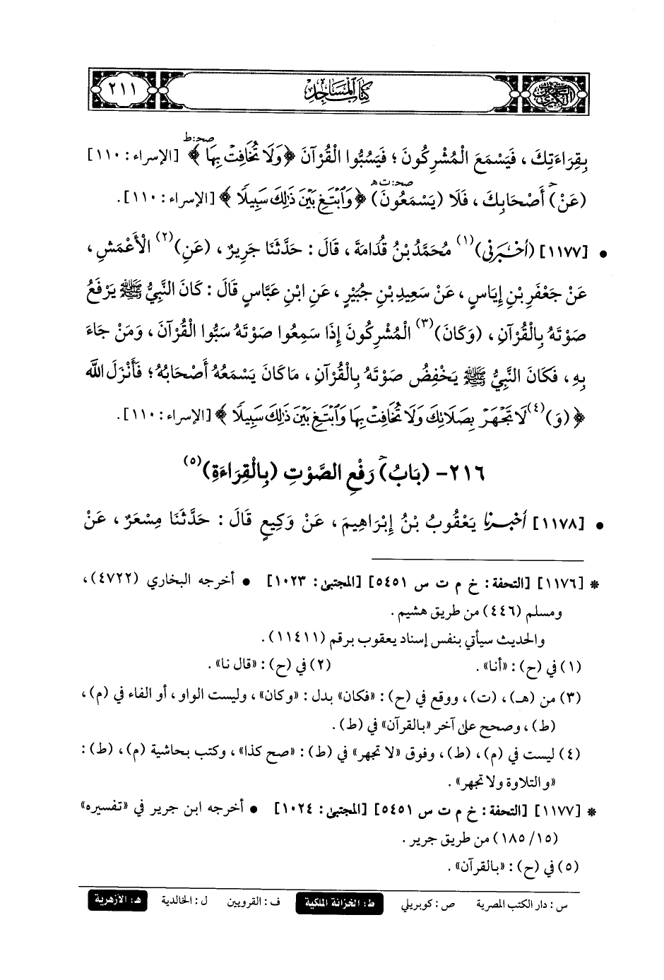 1177- أَخبَرني مُحَمدُ بنُ قُدَامَةَ، قَالَ: حَدثنا جَرِيرٌ، عَنِ الأَعْمَشِ، عَن جَعفَرِ بنِ إِيَاسٍ، عَن سَعِيدِ بنِ جُبَيرٍ، عَنِ ابنِ عَبَّاسٍ قَالَ: كَانَ النَّبيُّ صَلى الله عَليه وسَلم يَرْفَعُ صَوْتَهُ بِالقُرْآنِ، وَكَانَ المُشْرِكُونَ إِذَا سَمِعُوا صَوْتَهُ سَبُّوا القُرْآنَ، وَمَنْ جَاءَ بِهِ، فَكَانَ النَّبيُّ صَلى الله عَليه وسَلم، يَخْفِضُ صَوْتَهُ بِالقُرْآنِ مَا كَانَ يَسْمَعُهُ أَصْحَابَهُ، فَأَنْزَلَ اللهُ: {وَلا تَجْهَرْ بِصَلاتِكَ وَلا تُخَافِتْ بِهَا وَابْتَغِ بَيْنَ ذَلِكَ سَبِيلاً}.