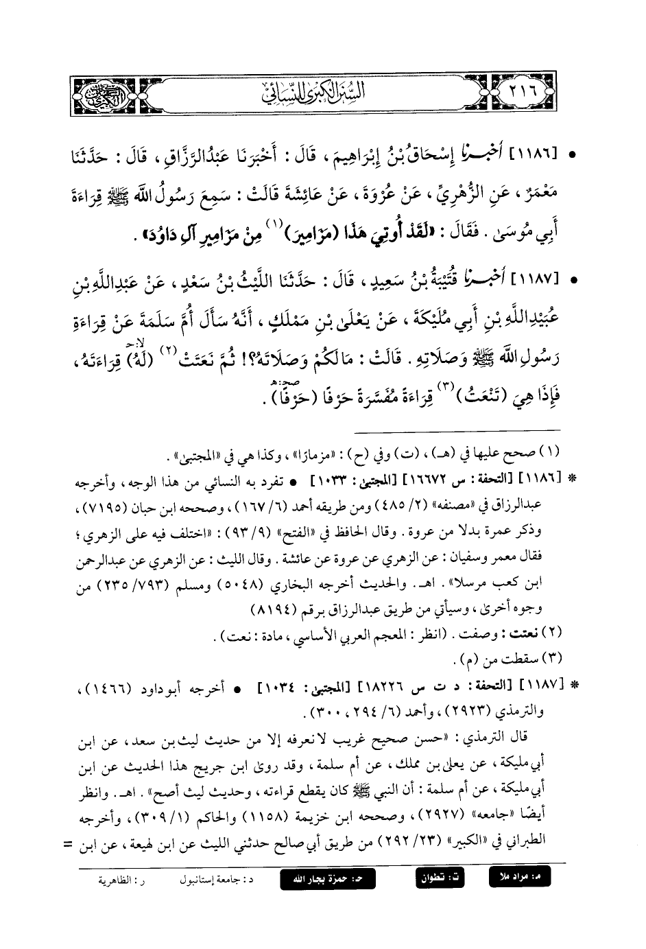 1187- أَخبَرنا قُتَيبَةُ بنُ سَعِيدٍ، قَالَ: حَدثنا اللَّيْثُ بنُ سَعْدٍ، عَن عَبدِ اللهِ بنِ عُبَيدِ اللهِ بنِ أَبي مُلَيْكَةَ، عَن يَعْلَى بنِ مَمْلَكٍ، أَنَّهُ سَأَلَ أُمَّ سَلَمَةَ عَن قِرَاءَةِ رَسُولِ اللهِ صَلى الله عَليه وسَلم وَصَلاتِهِ، قَالَتْ: مَا لَكُمْ وَصَلاتَهُ، ثُمَّ نَعَتَتْ لَهُ قِرَاءَتَهُ، فَإِذَا هِيَ تَنْعَتُ قِرَاءَةً مُفَسَّرَةً حَرْفًا حَرْفًا.